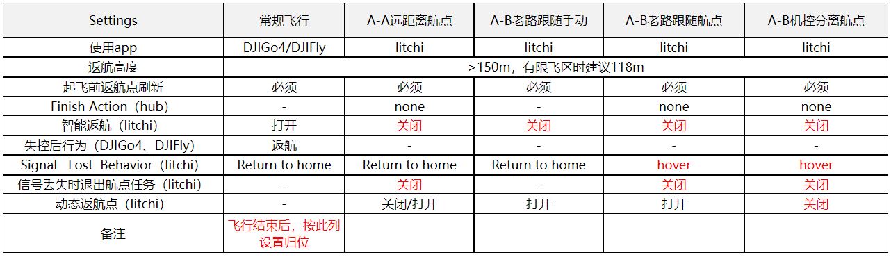 | 智能返航(litchi) | 打开 | 关闭 | 关闭 | 关闭 | 关闭 |