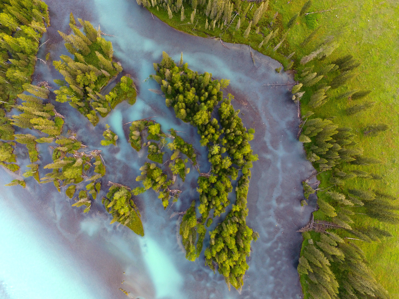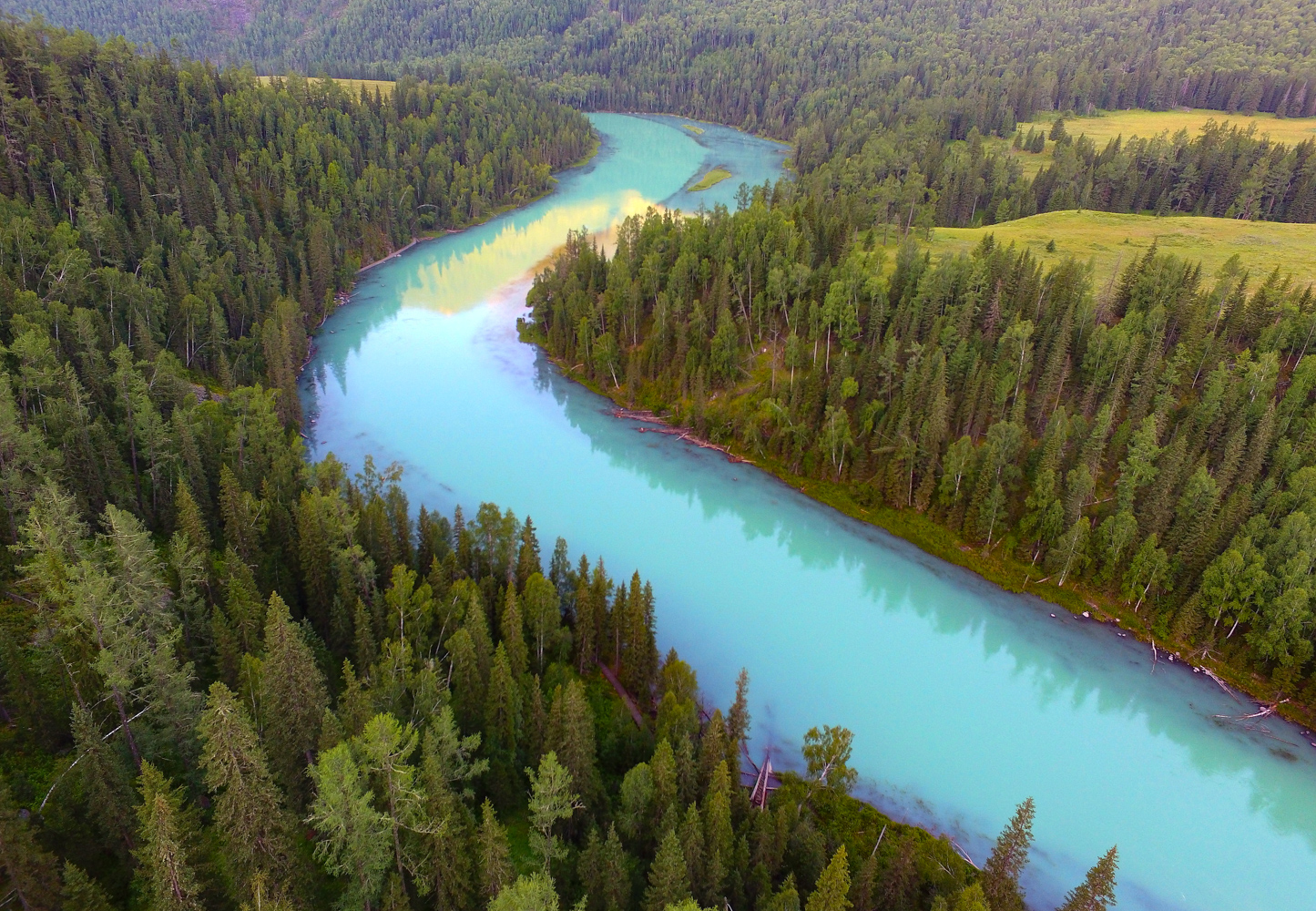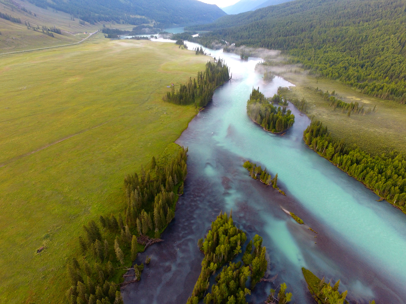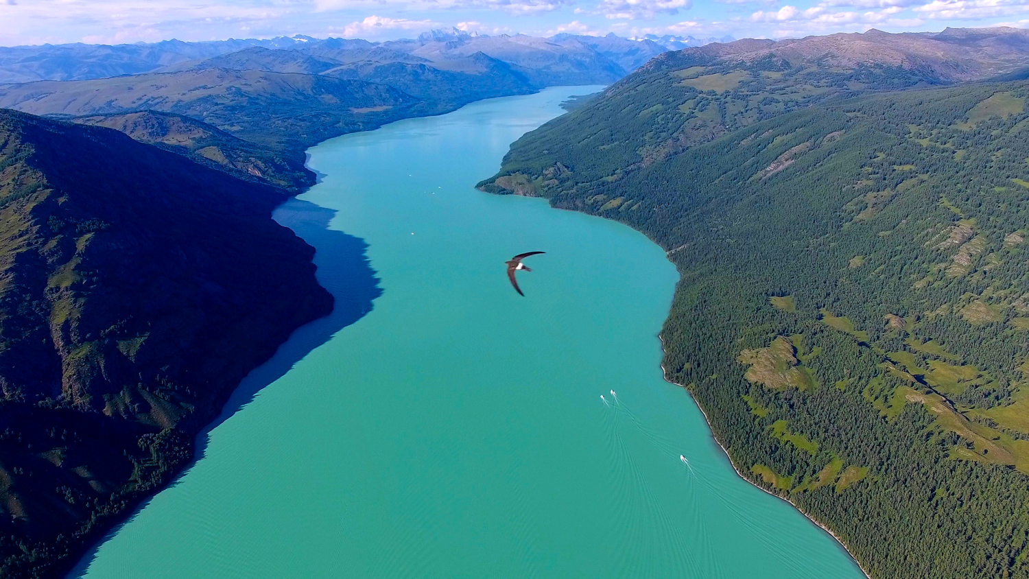 喀纳斯是个很大的景区,不能开车进入,只能改乘景区班车进入。观鱼亭不能免俗,爬之。这个高度鱼是观不到了,就看看蓝绿色的喀纳斯湖足矣。巧的是恰好有一只鸟飞过无人机镜头。