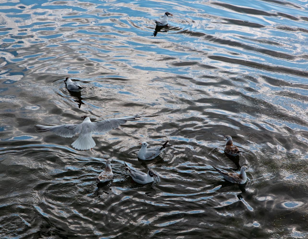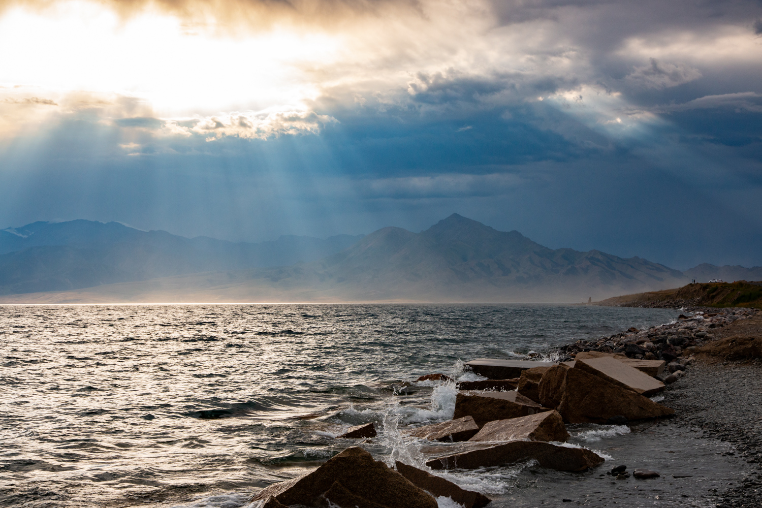 阳光穿过阴天的云层,丁达尔光照射波光粼粼。