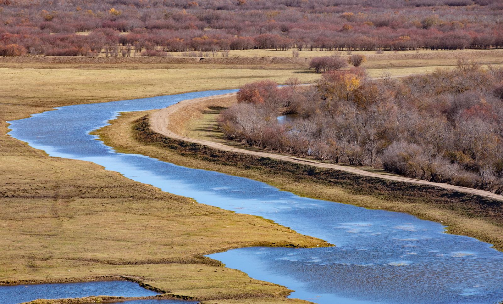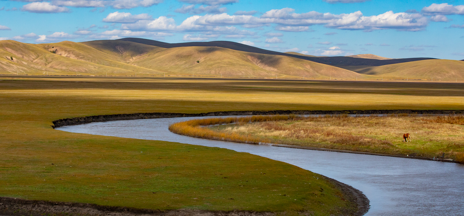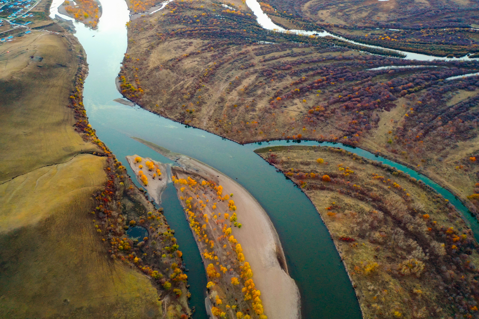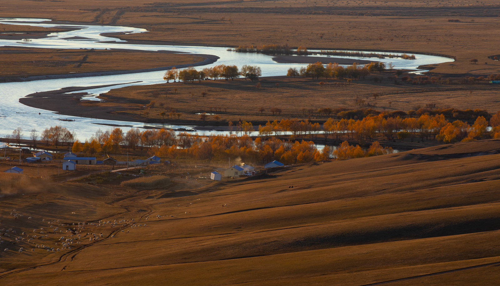 东侧则是百转千回的伊敏河。这里的河流很有意思,各种彩色的树总是围着河岸生长,稍远一些则是清一色的、无比均匀的平原草毯。