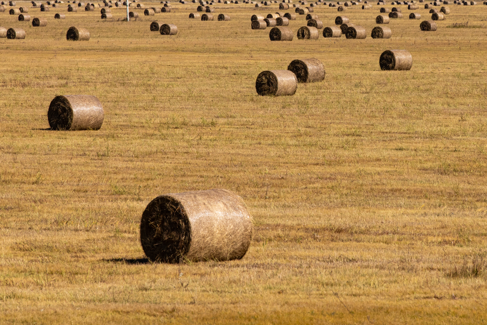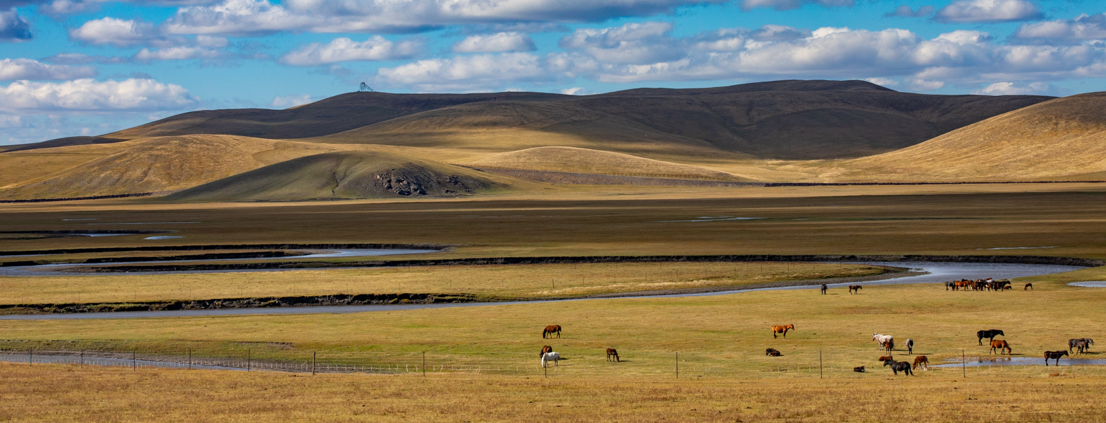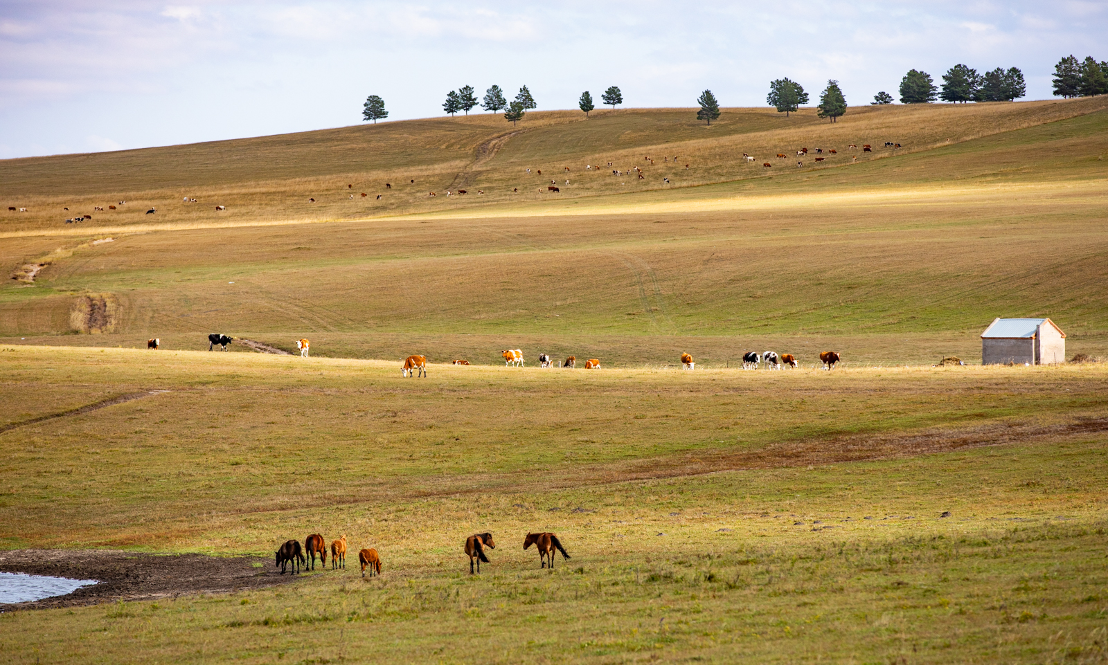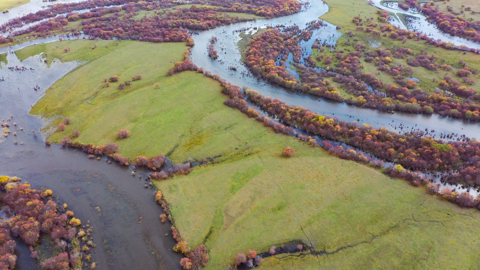 东侧则是百转千回的伊敏河。这里的河流很有意思,各种彩色的树总是围着河岸生长,稍远一些则是清一色的、无比均匀的平原草毯。