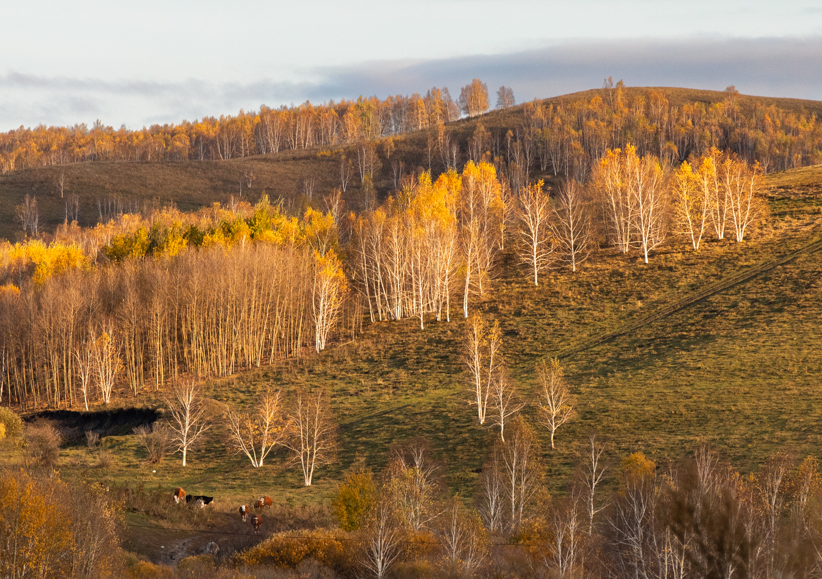 黄昏时分的光线总是最好的。黄昏下的白桦林,这是东北最常见的一种树,白色的枝桠纹理分明,百看不厌。