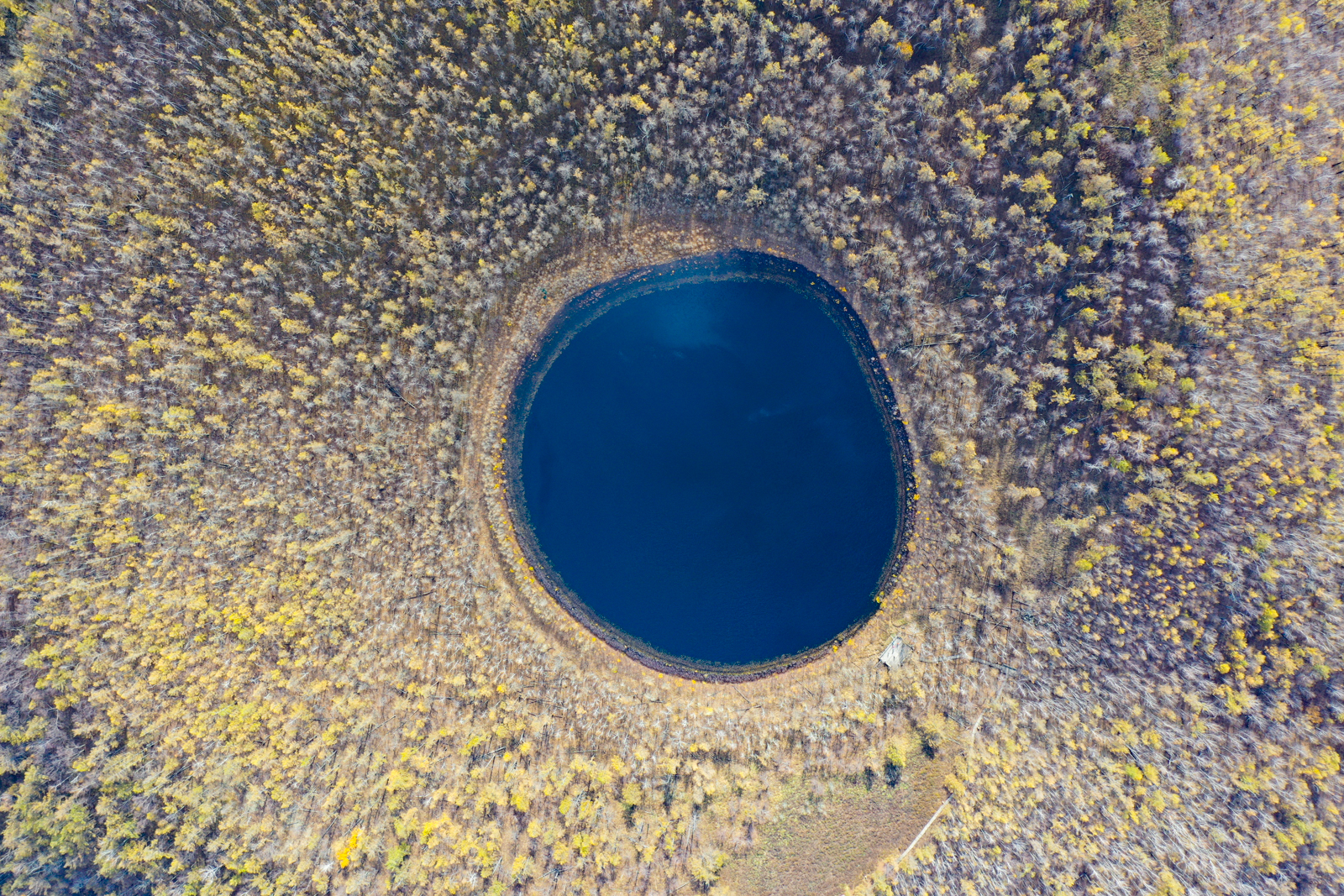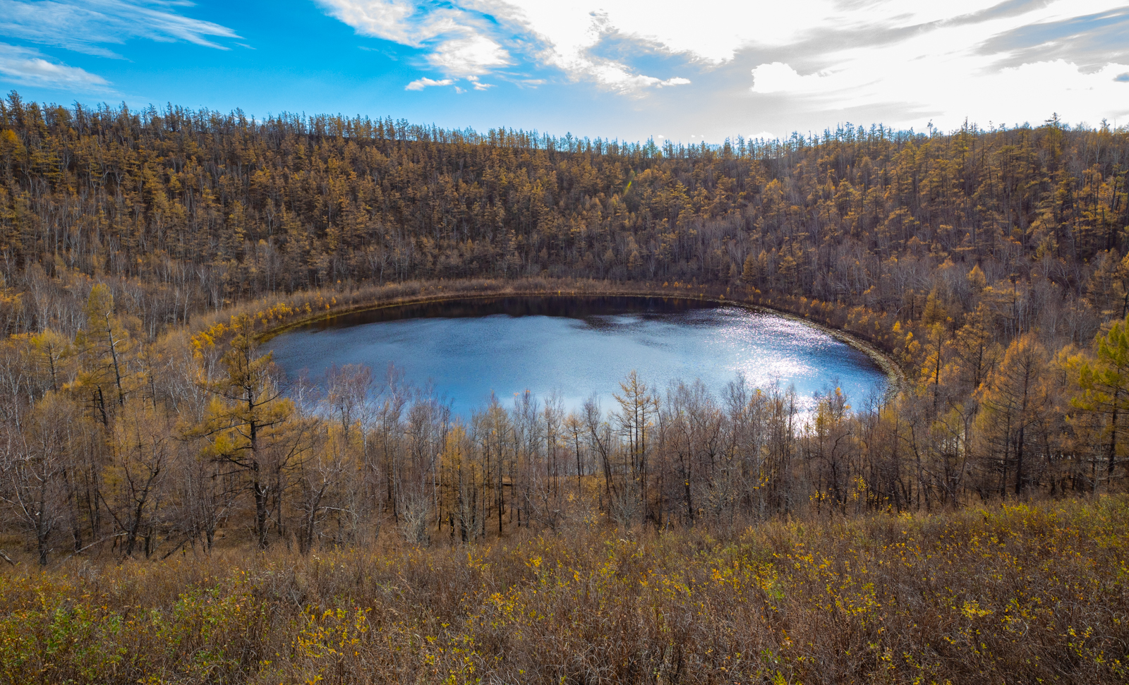 柴河月亮天池是一个火山口,可以驱车直至山脚,再爬上一阵即可到达。500米的高度俯拍,刚刚好。