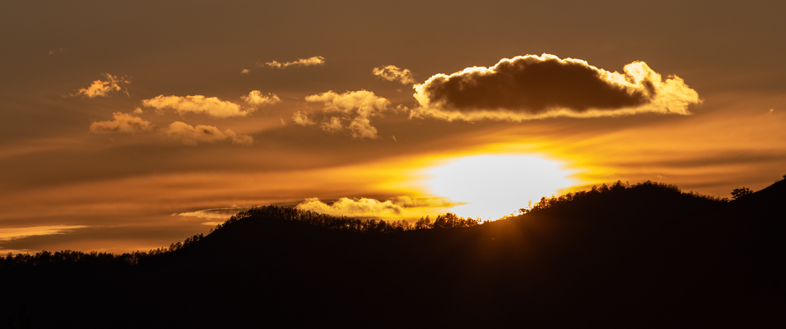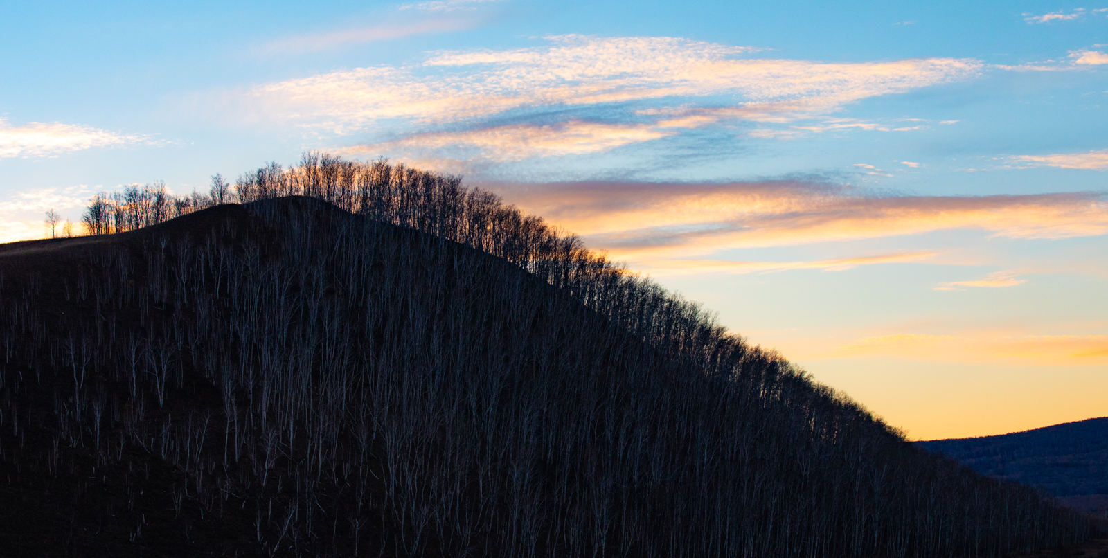 东北的山上通常都长满了植被和树,日落的时候照出毛茸茸的感觉。