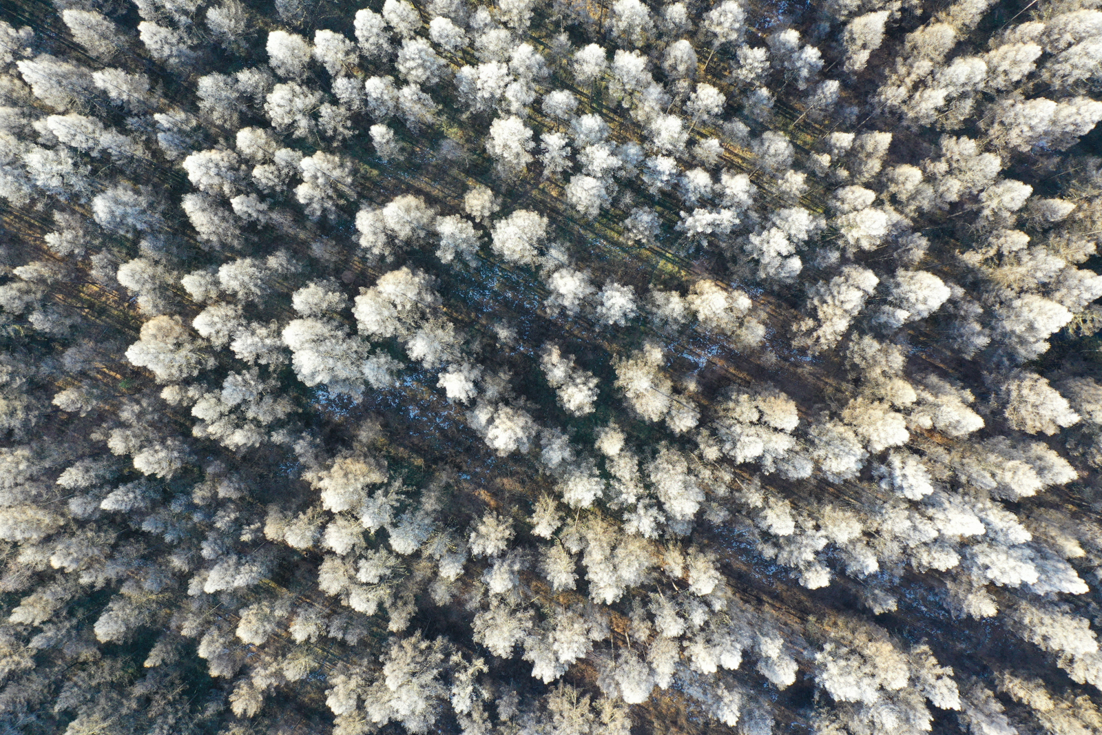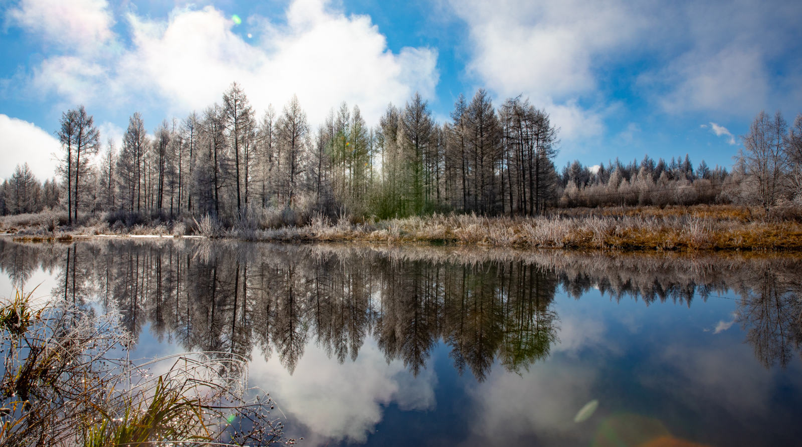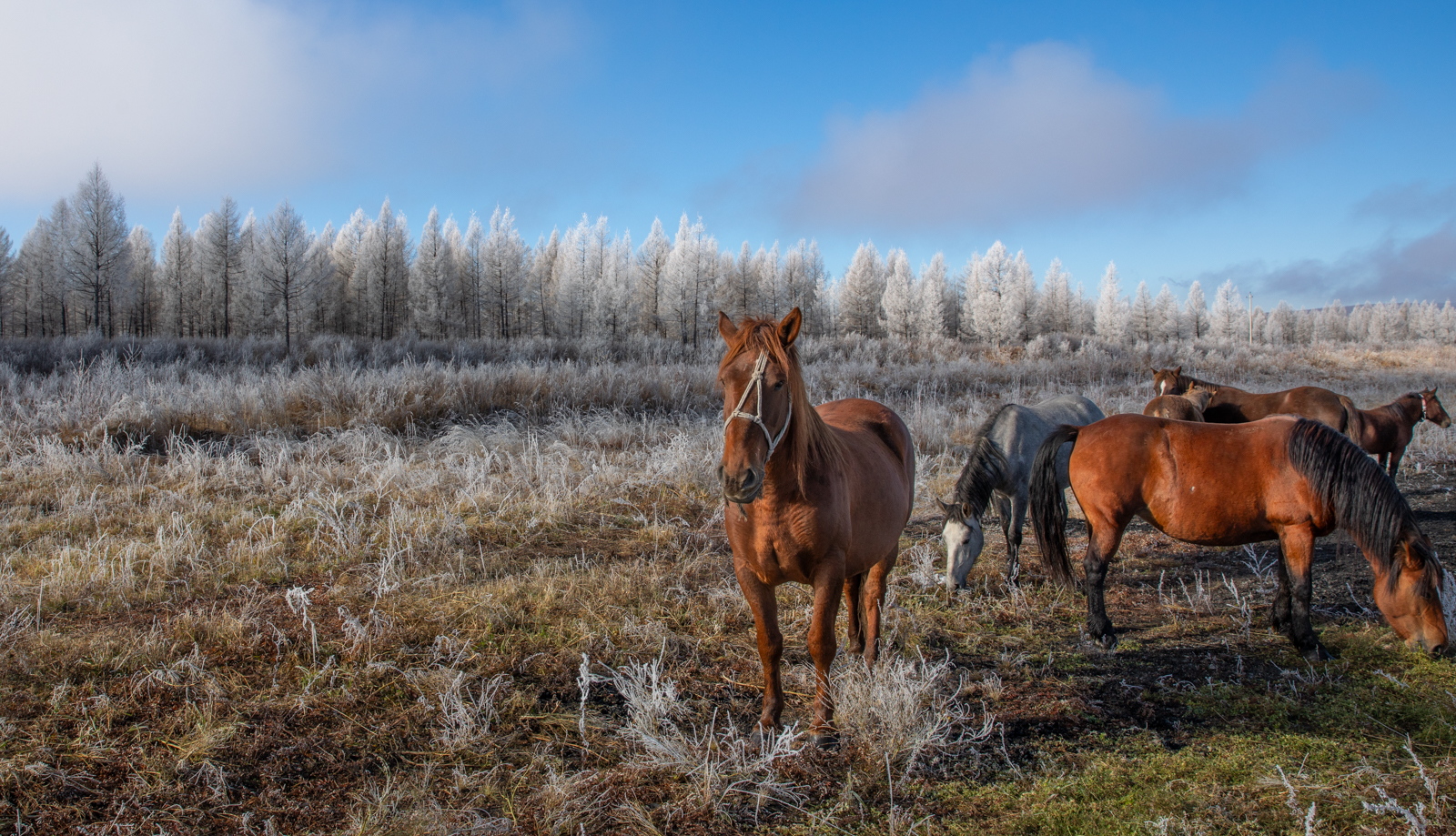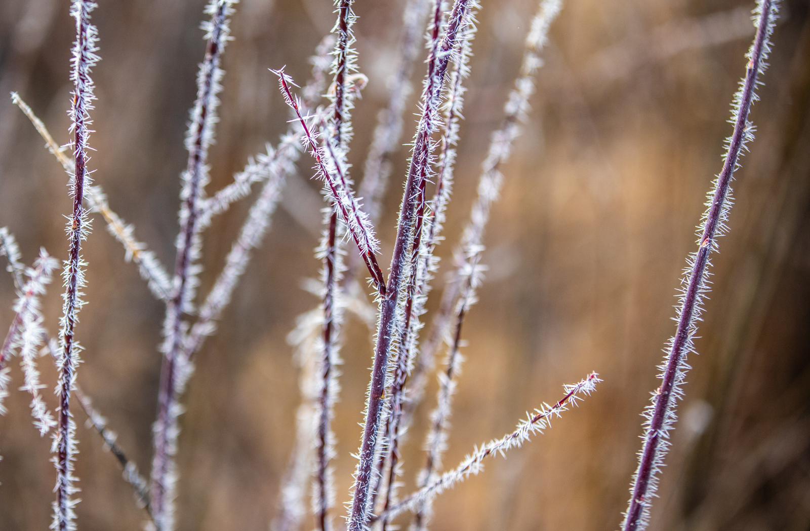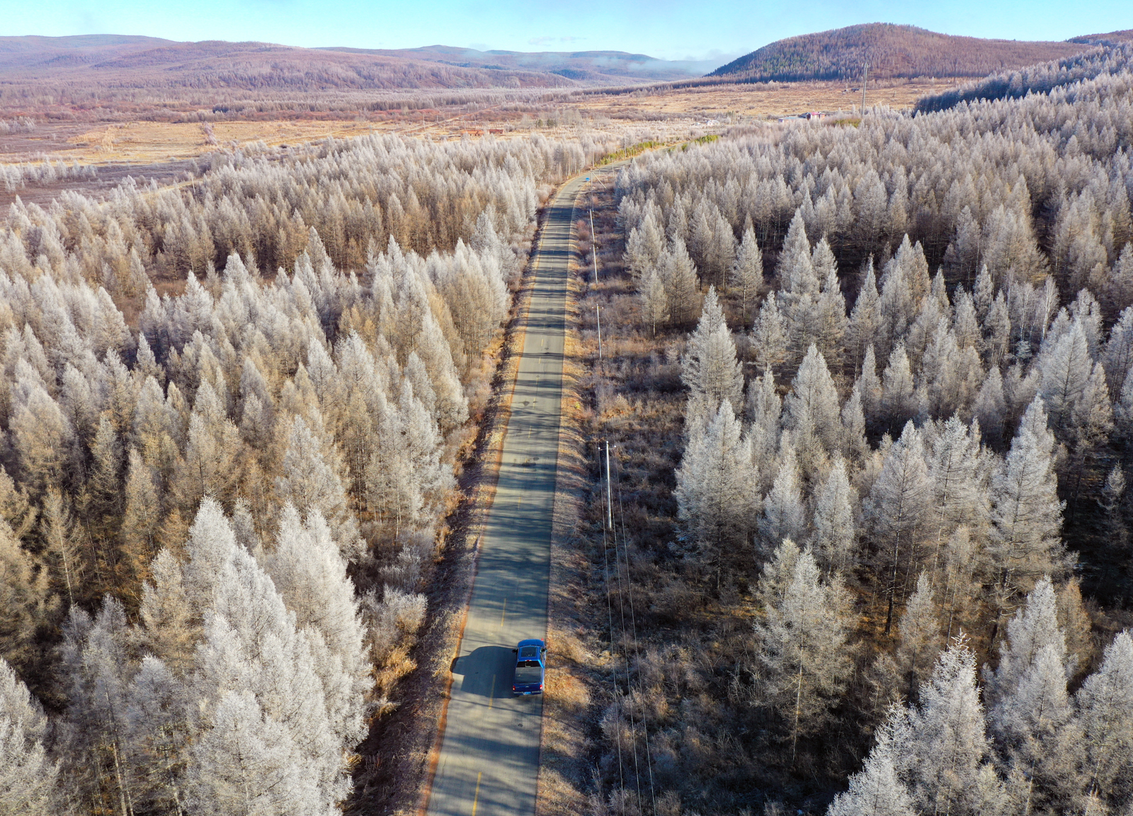 清晨赶路,发现意外之喜。夜间的白霜还没有化去,我们于是见到了大片的雾凇。先来一张细节。