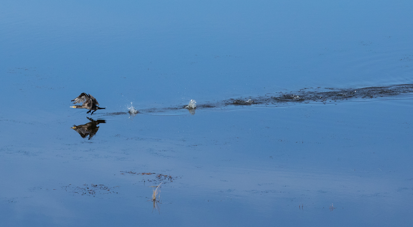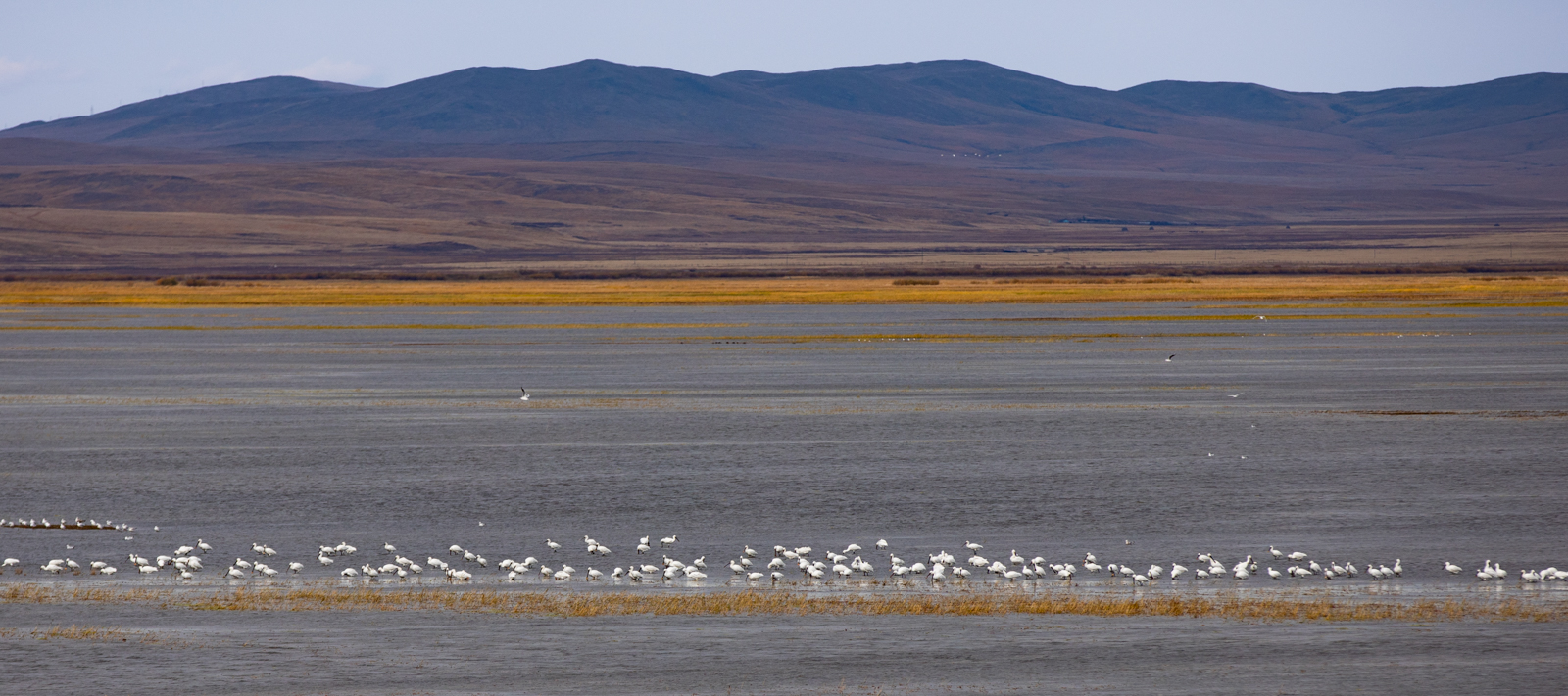 已经记不得在何处,看到这样一排水鸟,和远处的湖岸、山脉,形成一个完美的构图。