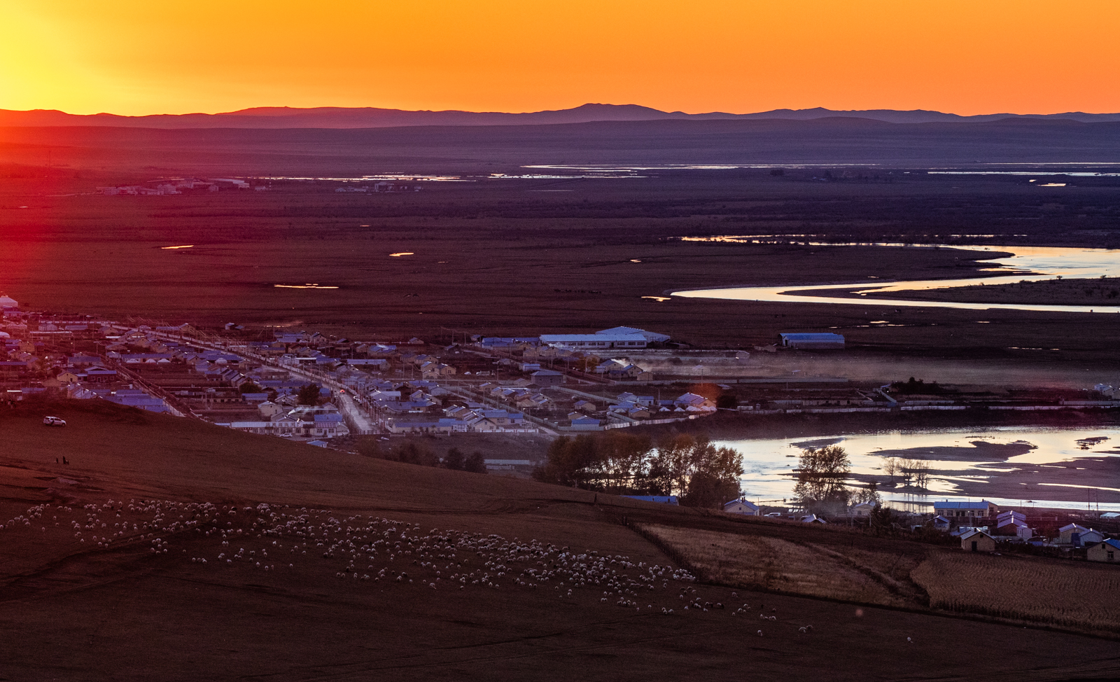 黑山头以壮美的日落闻名,这次也没有让我们失望。炊烟和羊群相得益彰。