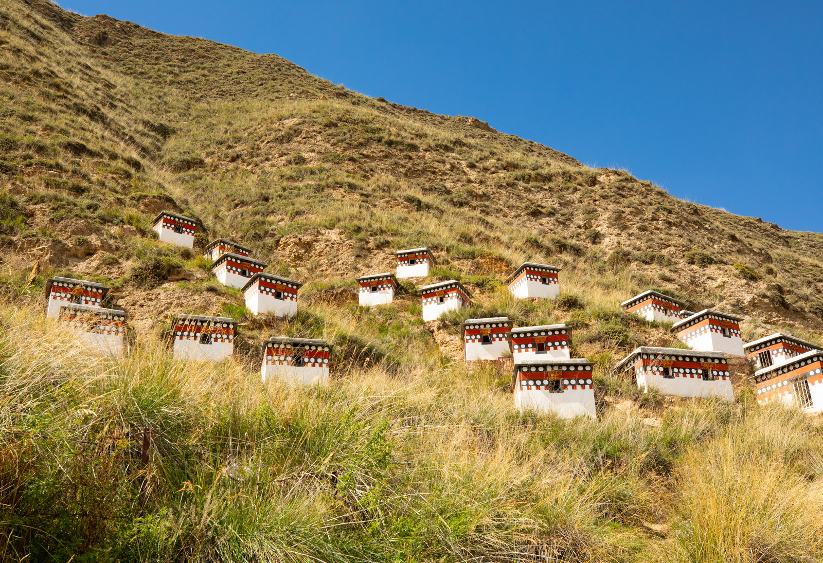 一进拉卜楞寺,很难不注意到后山上一小片一小片的“小房子”。从寺内绕出来,从后山山脚返回时,恰好路过那里。了解了一下,这些原来是“大德”们闭关的地方,里面没有空调没有水,也不会被游人打扰,据说可以让修行更专注……嗯,我们这些游人多少是有点责任的。