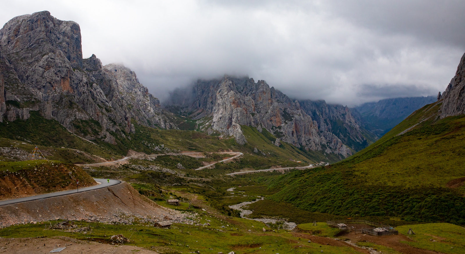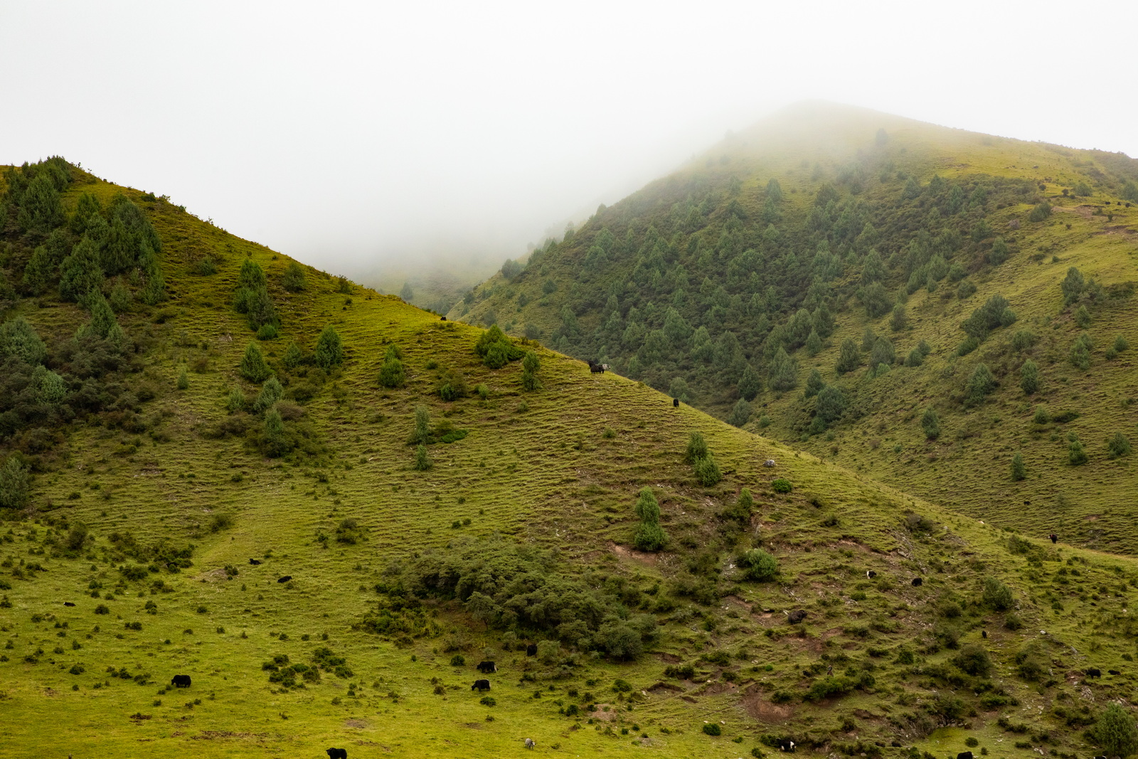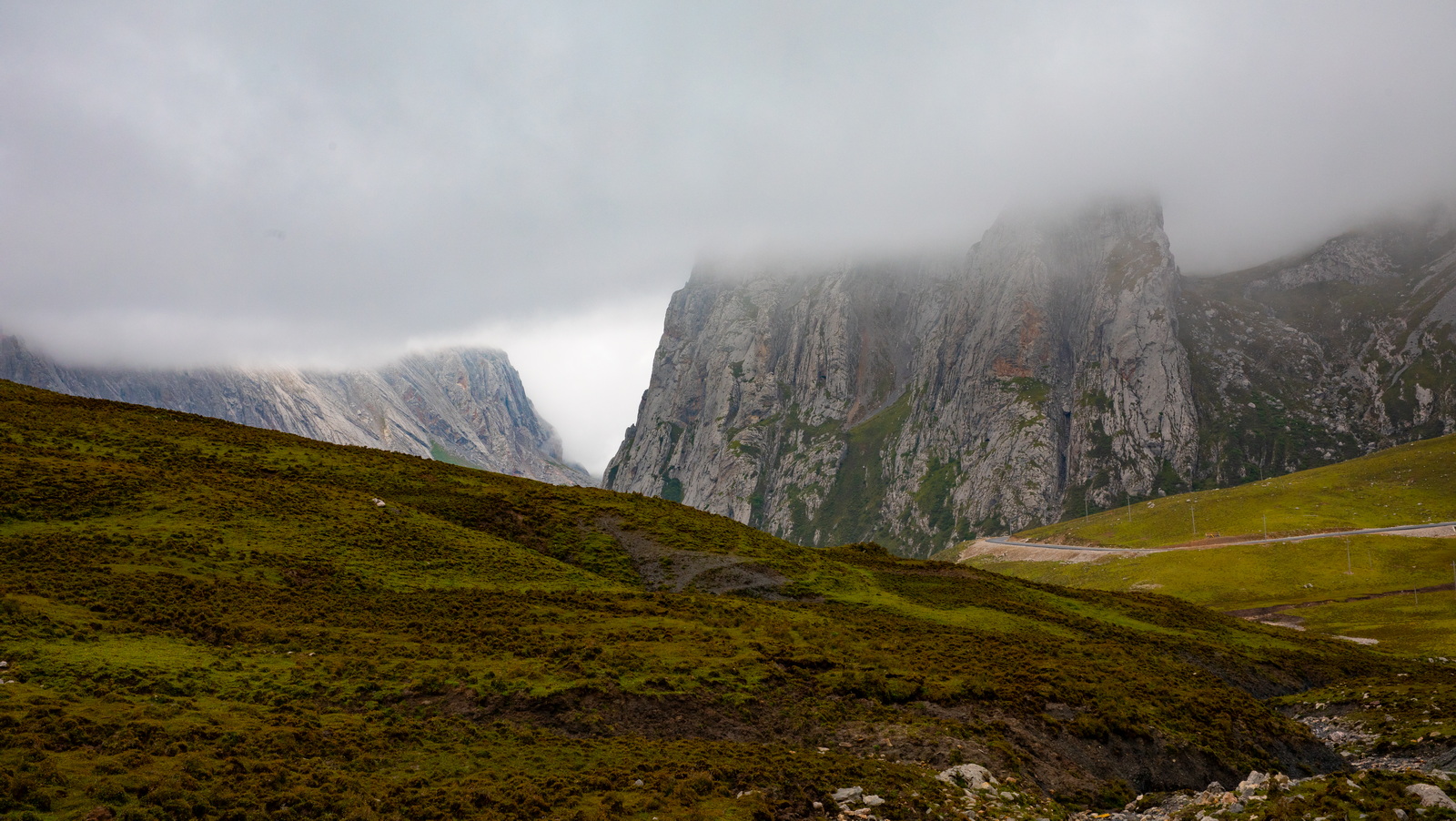 当第一段洛克公路的铺装路面终于走到终点时,伴随“烂路”而来的,是更浓的雾。很快我们完全进入了云雾之中,能见度急剧降低至数十米。美景不复可见,只能跟着前车的尾灯龟速前行,大部分路段没有任何手机信号,音乐也戛然而止,幸好普拉多优秀的减震让旅程不至于过分痛苦。看来仙境只能远观,不可亵玩。不过小哥的“烂路之后就是美景”言犹在耳,是我们继续前进的动力。漫长的1个小时过去,30公里的“烂路”终于结束,洛克公路的高程也不断降低。从“天上”回到“人间”,景色果然一变,奇峰异石变成了柔美草毯,这就是网上所谓的洛克公路中段了。