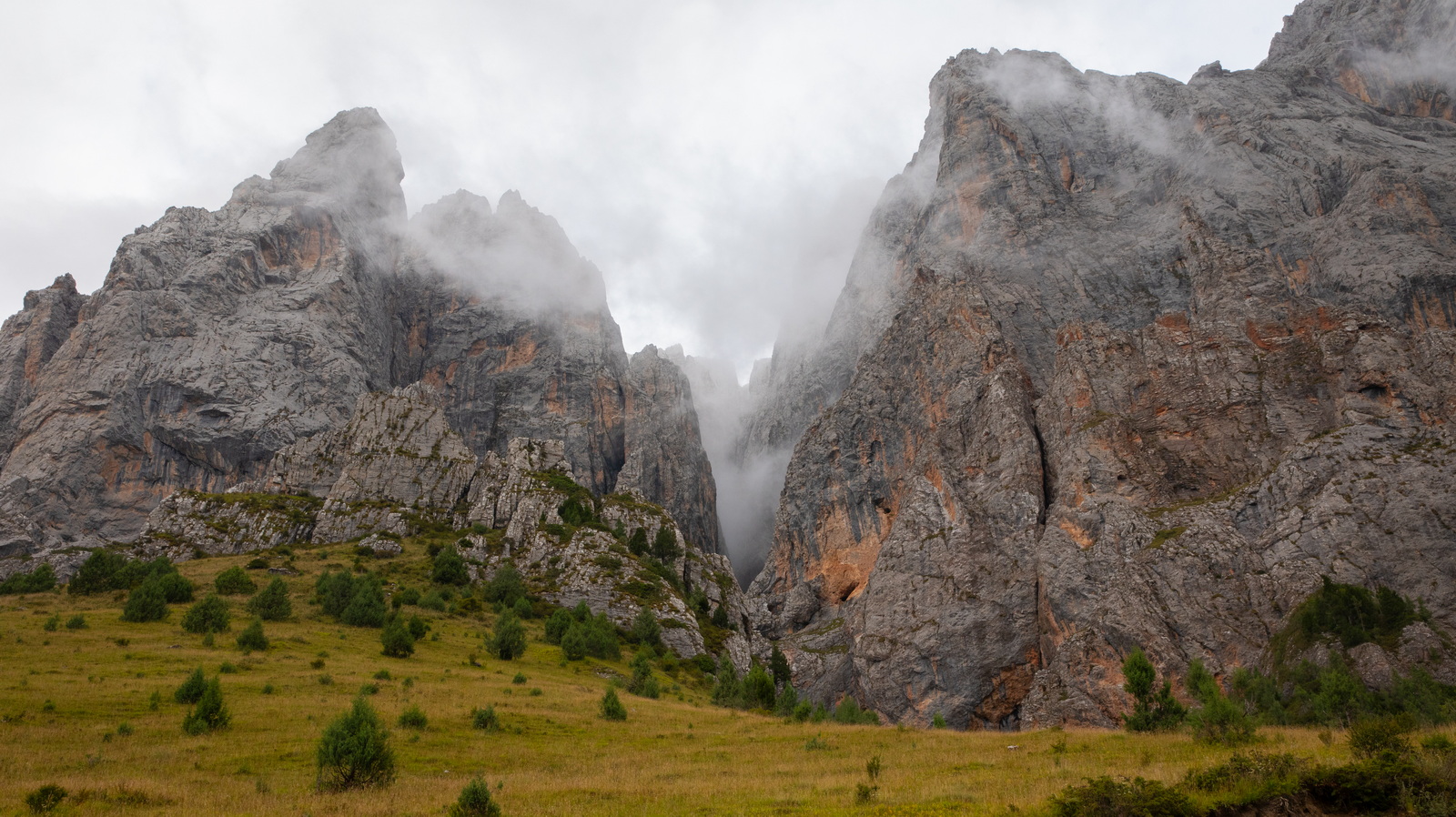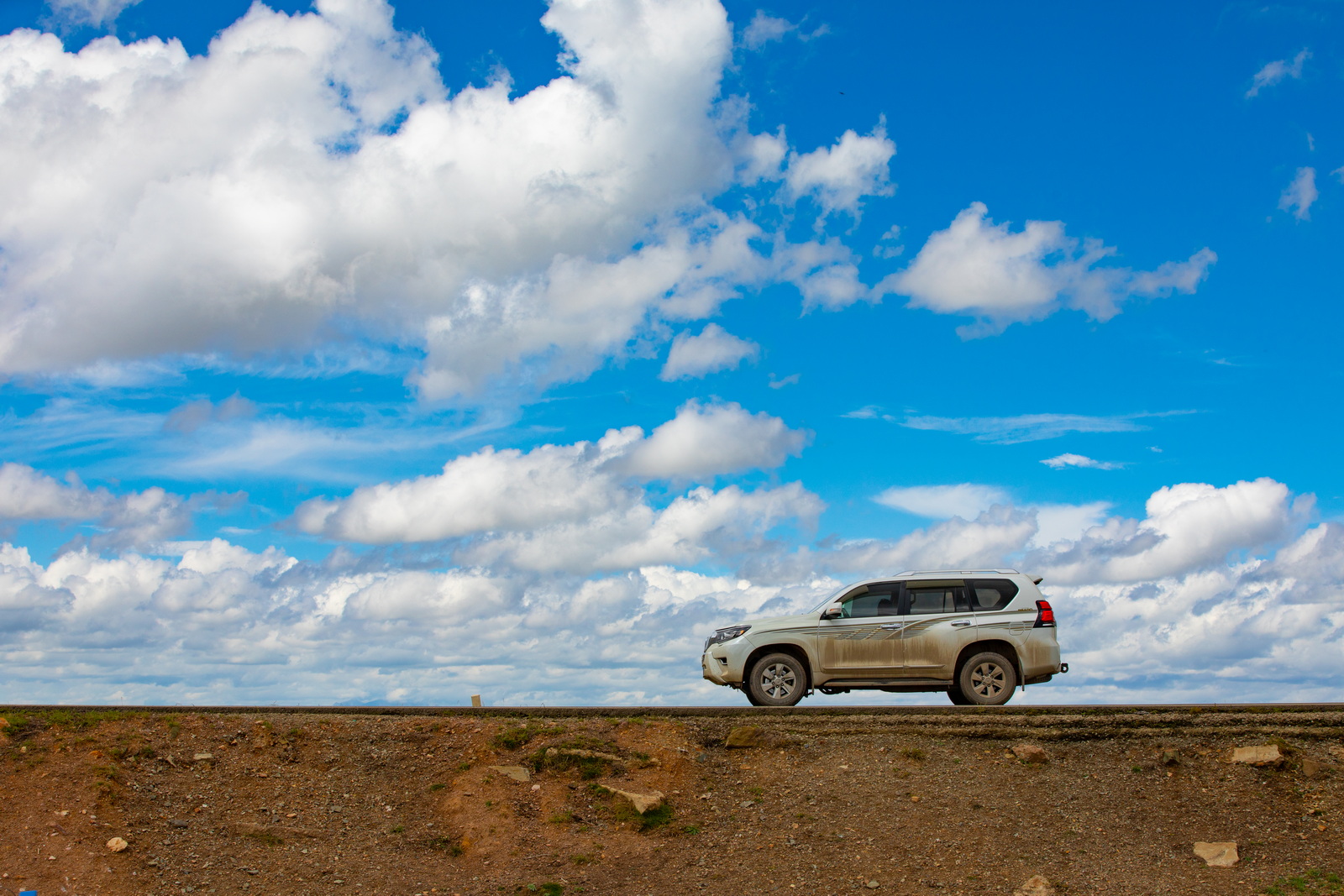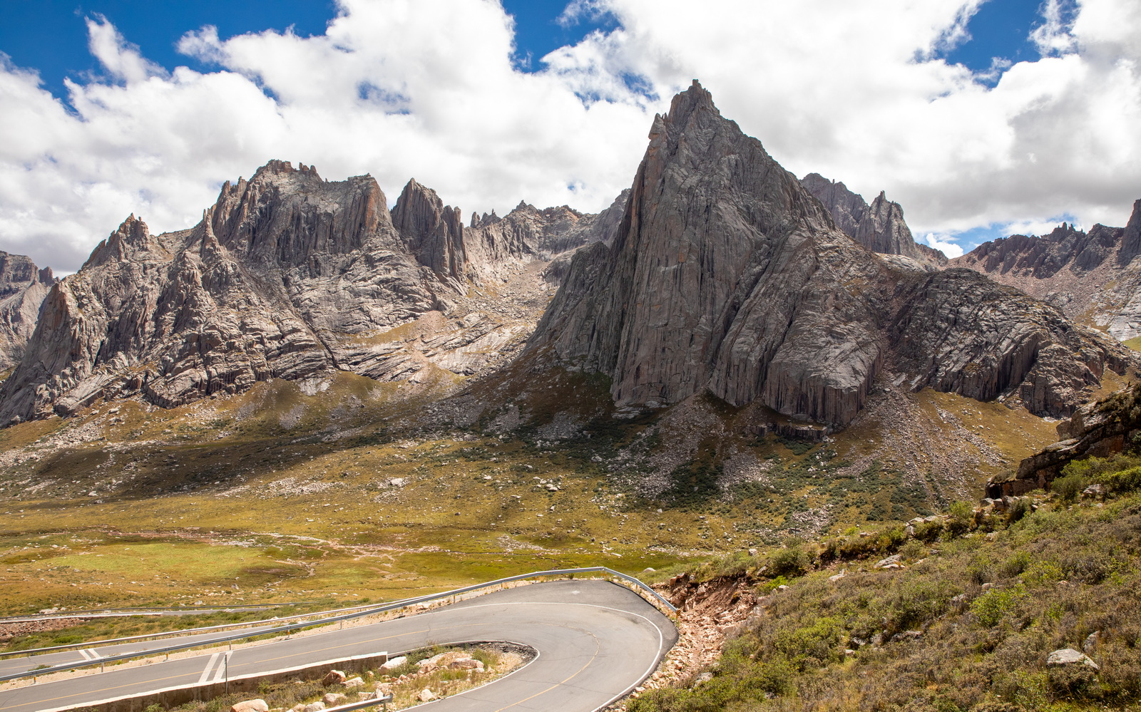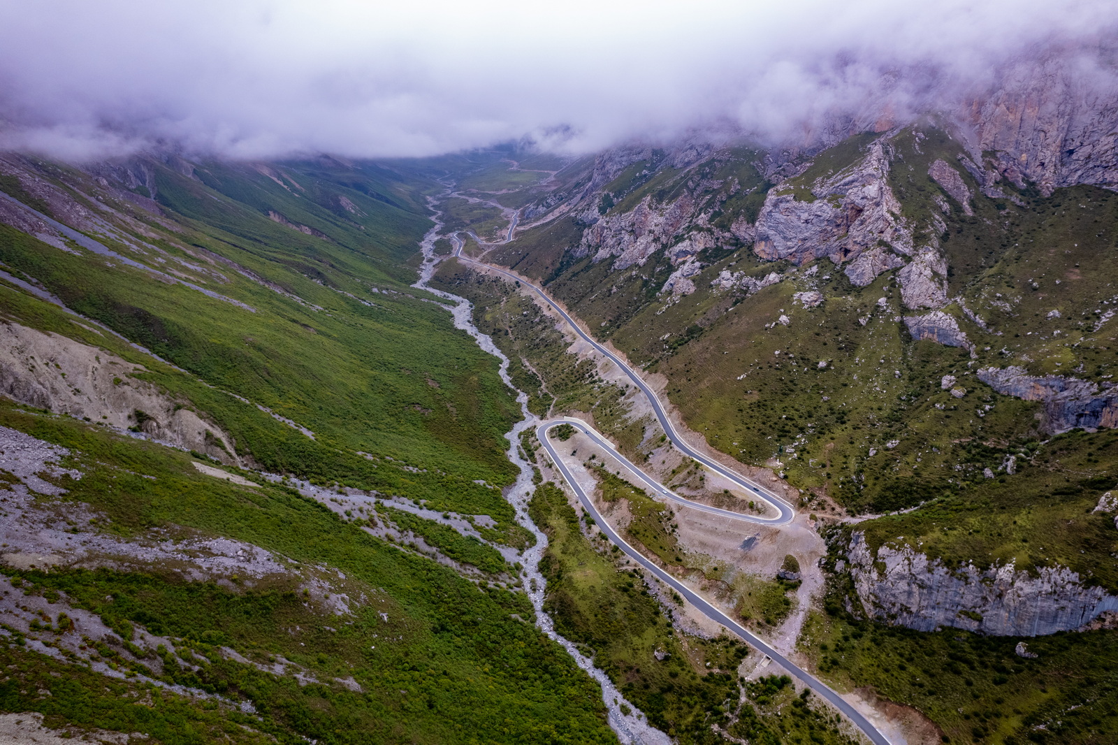 当第一段洛克公路的铺装路面终于走到终点时,伴随“烂路”而来的,是更浓的雾。很快我们完全进入了云雾之中,能见度急剧降低至数十米。美景不复可见,只能跟着前车的尾灯龟速前行,大部分路段没有任何手机信号,音乐也戛然而止,幸好普拉多优秀的减震让旅程不至于过分痛苦。看来仙境只能远观,不可亵玩。不过小哥的“烂路之后就是美景”言犹在耳,是我们继续前进的动力。漫长的1个小时过去,30公里的“烂路”终于结束,洛克公路的高程也不断降低。从“天上”回到“人间”,景色果然一变,奇峰异石变成了柔美草毯,这就是网上所谓的洛克公路中段了。