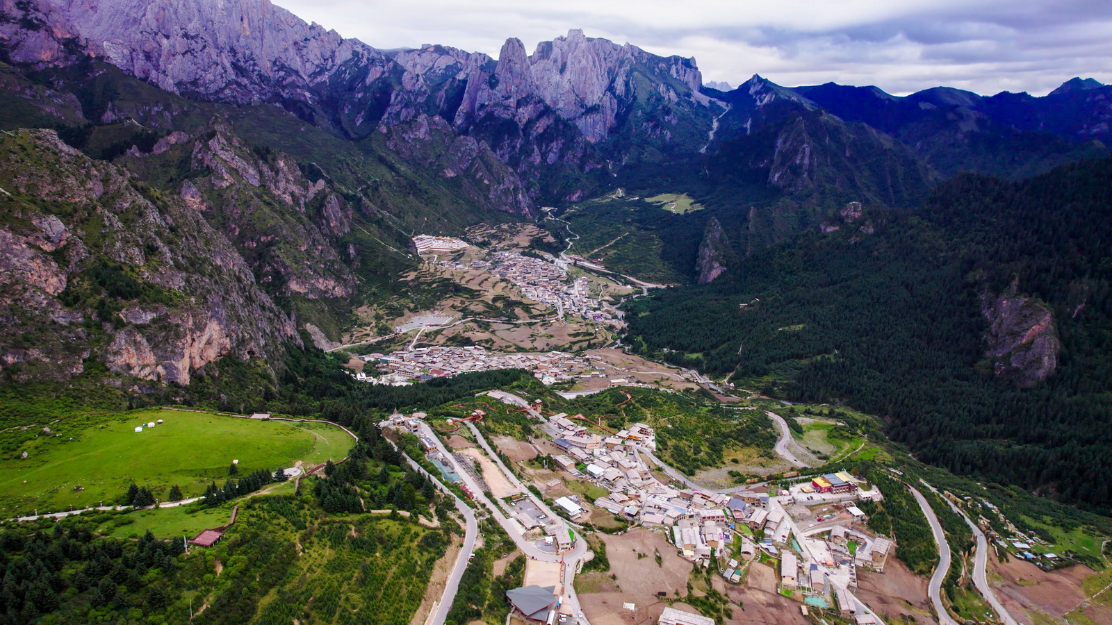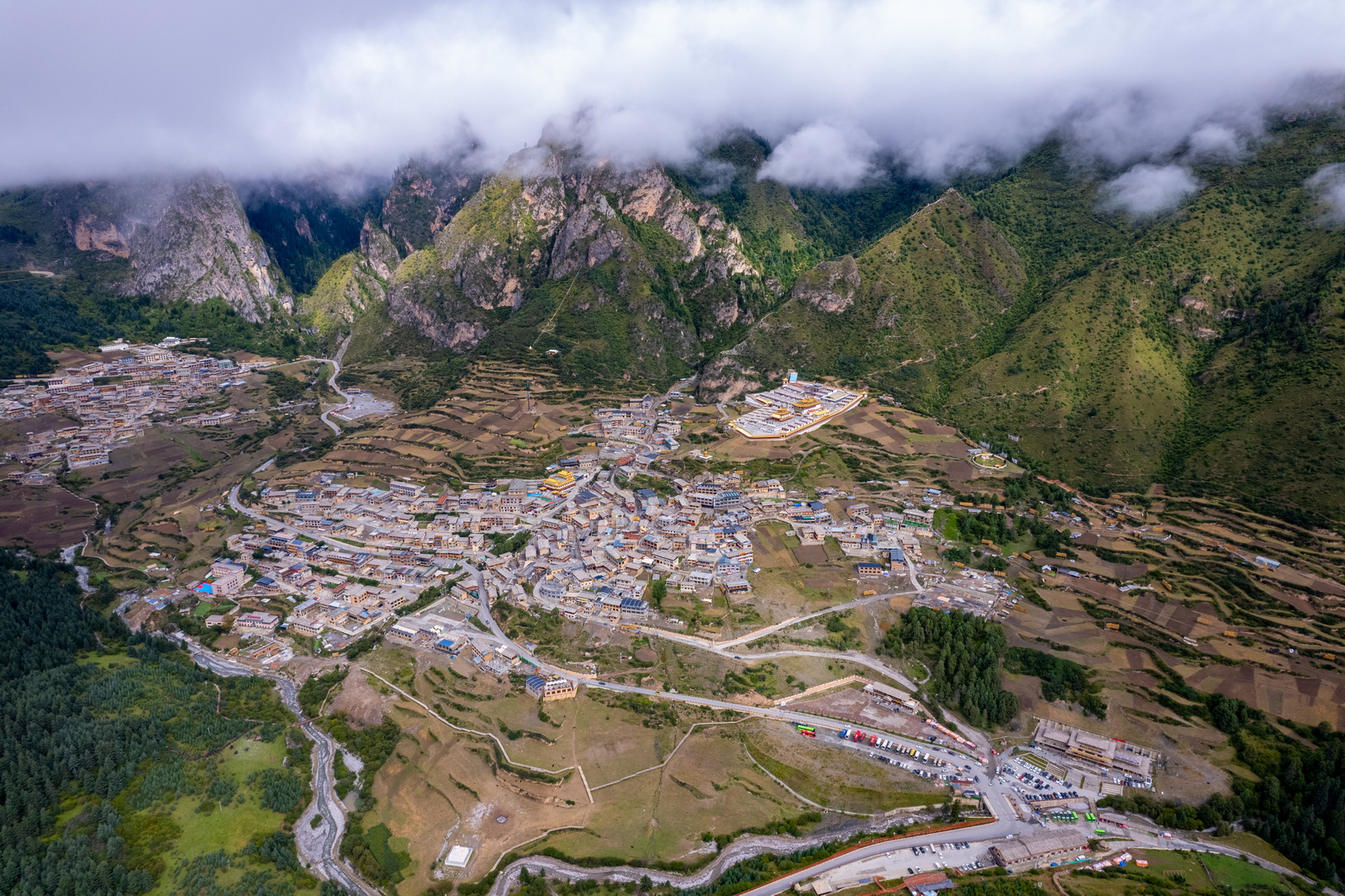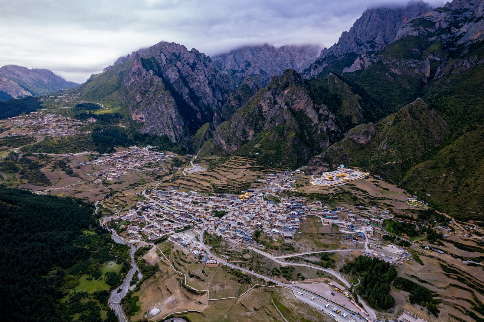 坦率地说,中段的景色虽然不错,但与起点那段相比,还是有不小的差距。我们不信邪地继续往前,直至开到洛克公路的终点:这才发现我们以为的“终点”,其实是洛克公路的起点,网友们推荐的方向是自北向南,那将体会到逐级增加的精彩;我们则是反其道而行之,难免觉得虎头蛇尾了。匆匆打了个卡,立即折返,还有一个扎尕那的黄昏在等着哪。又是2个多小时,终于再次走完全长100公里的洛克公路,天气太阴,想象中的扎尕那的黄昏光线并没有出现。所幸云层还比较高,小小地航拍一下全貌还是可以的。