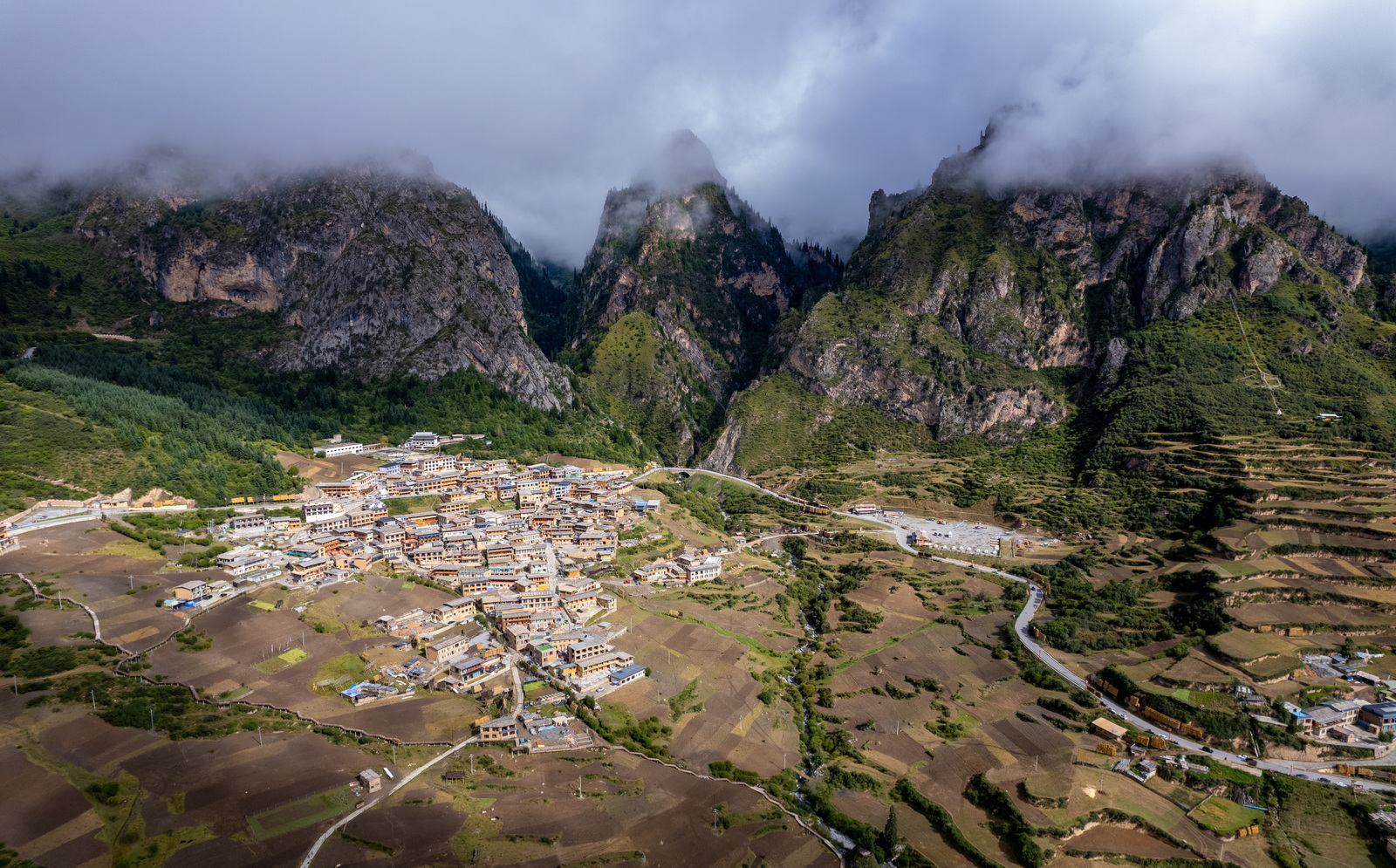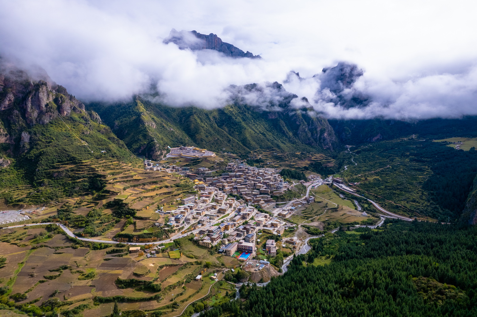 入夜时,预报的小雨终于还是落了下来,把村内闲逛的我们淋成两只小小的落汤鸡。原定的星空、日出计划同时宣告泡汤。闹钟还是不甘心地订了,第二天日出的点拉开窗帘一看,嗬!白茫茫一片。“昨天好歹已经看过了”,在自我安慰中吃完早饭,退了房,路过达日观景台时,意外发现由于山脚的地势较低,整个村子仍然可以看到。拍了几张,只能说是凑合,于是继续下山。未料经过几个转弯,一缕阳光穿破云层投射了下来!太棒了!停车、拉开后备箱,一把掏出无人机,机不可失,时不再来。