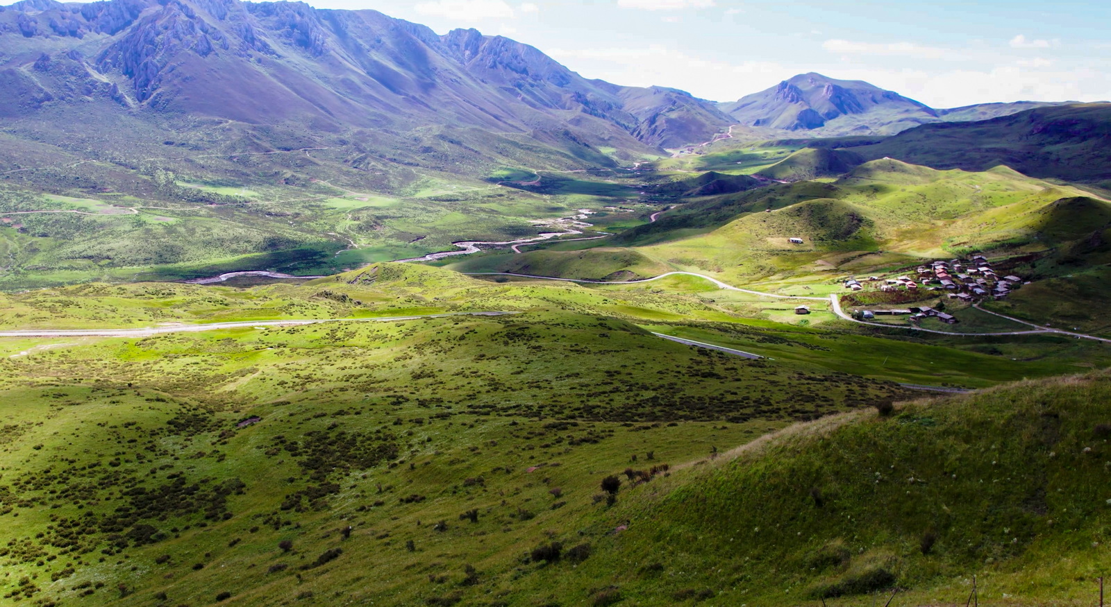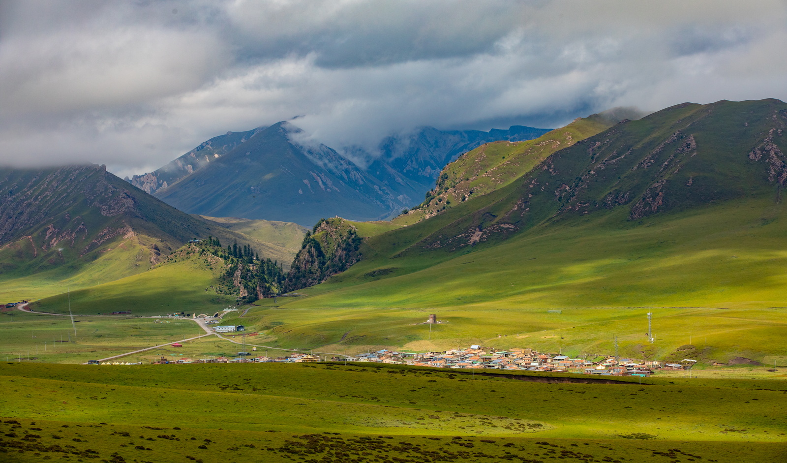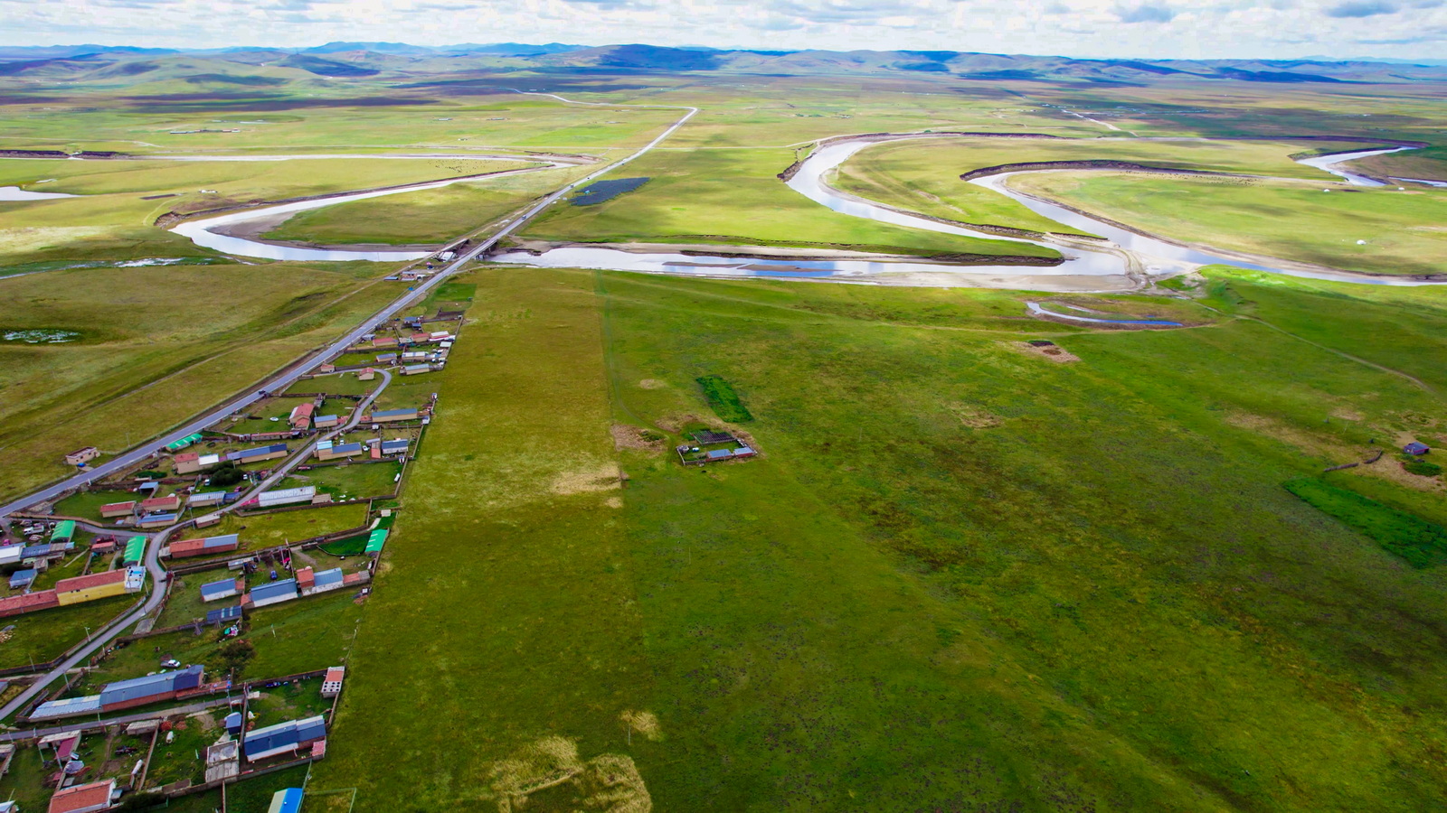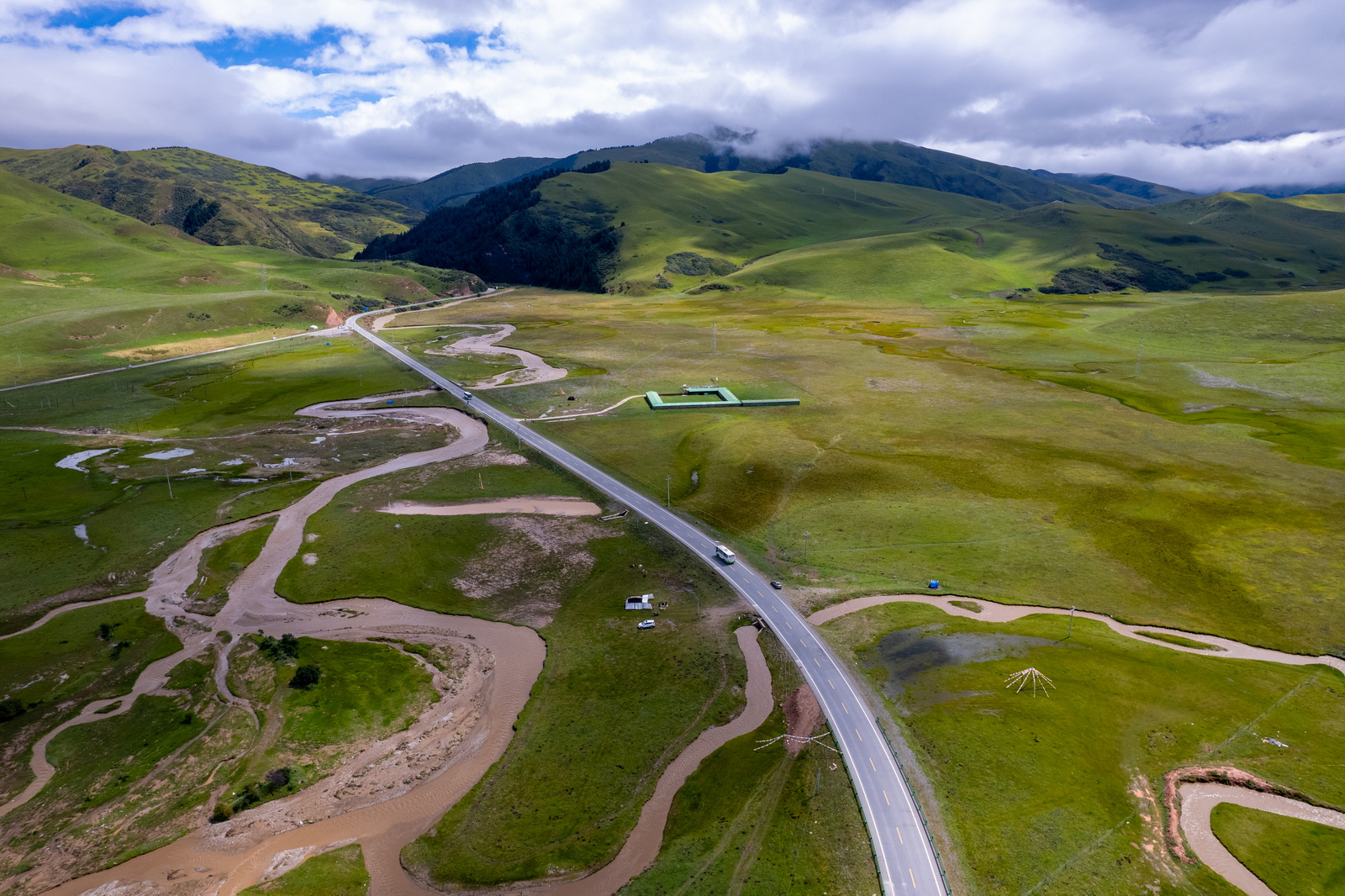 虽然没有拍到星空和日出,但这样的景色已经足够圆满。足足用无人机拍完两块电池,这才依依不舍地离开。不过今天的惊喜还没有结束。从扎尕那出来向南,再向西,穿过一片大山,从一处垭口转出,眼前豁然开朗,一望无际的绿色跃入眼帘。若尔盖草原名不虚传,一出场就是惊艳。