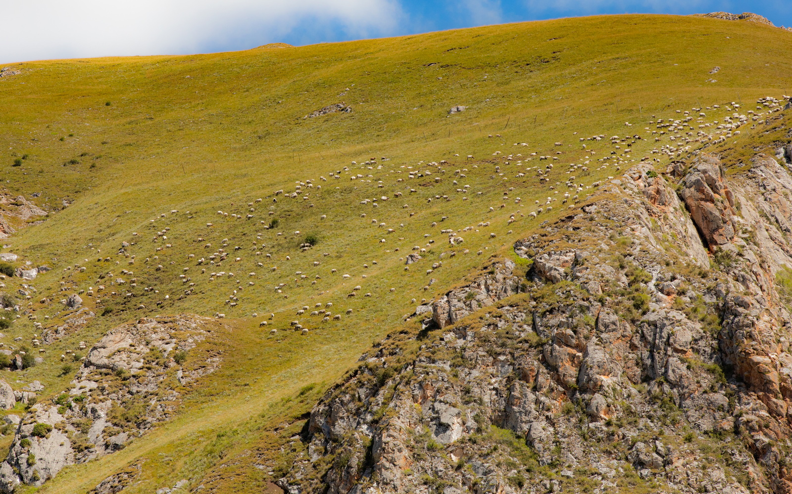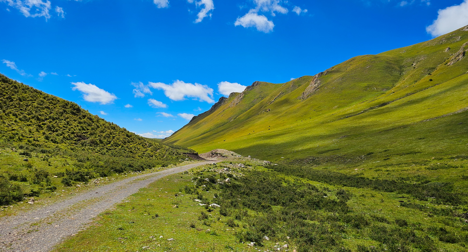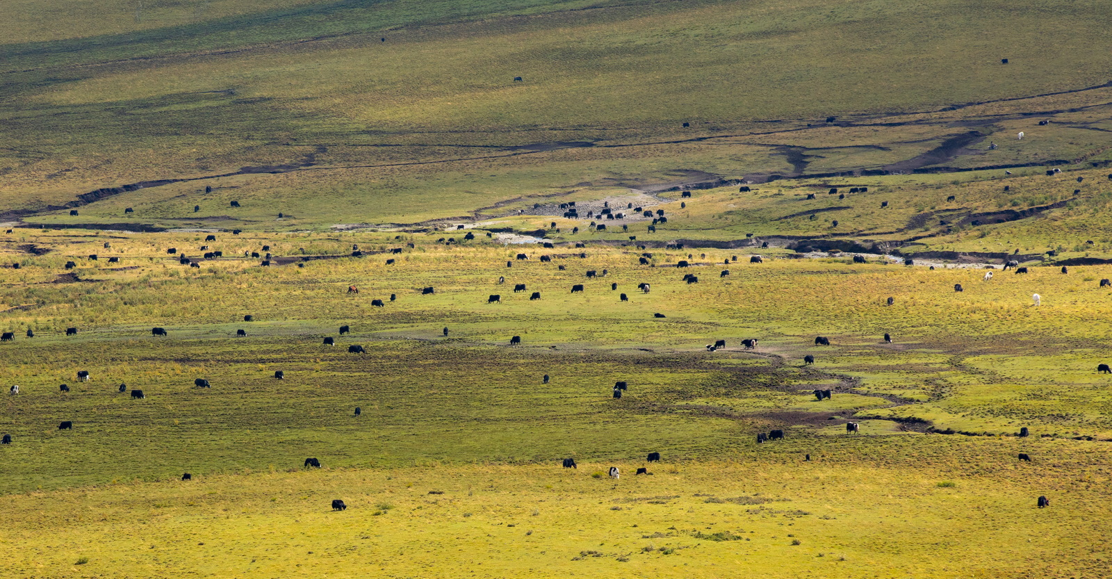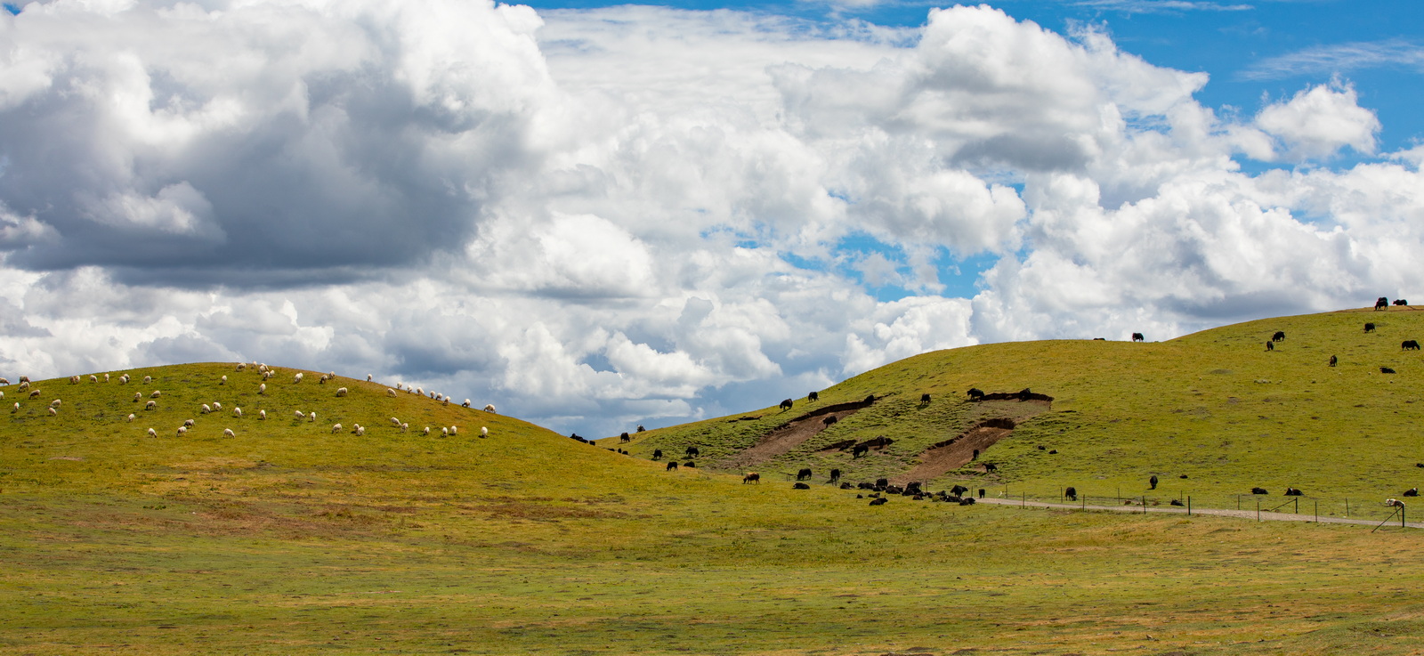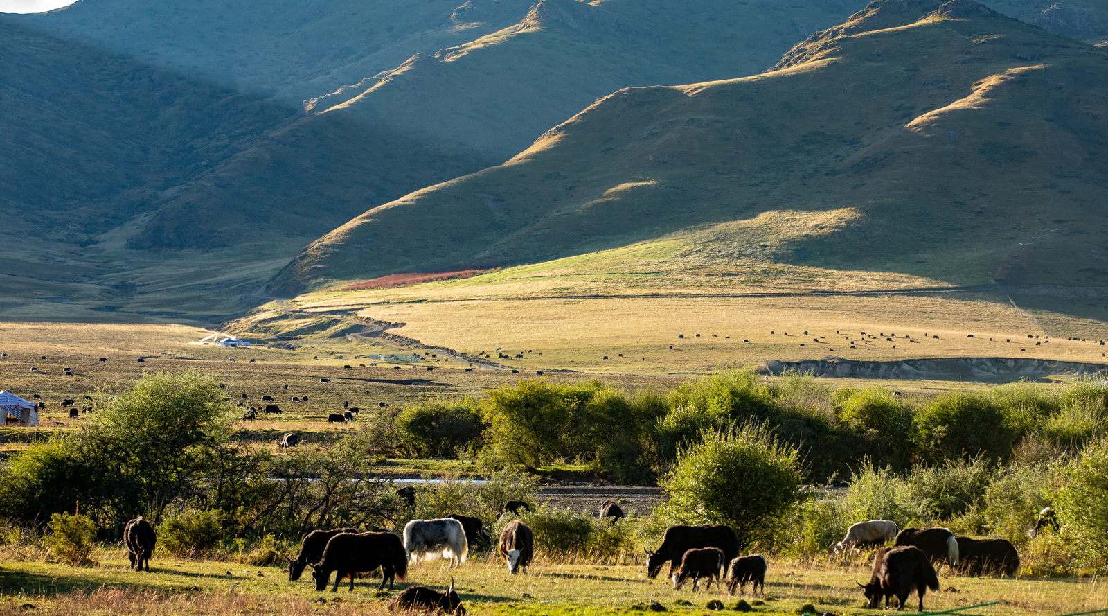 远处山坡柔美的线条里,是悠然吃草的羊群和牛群。各守一片,相安无事,岁月静好……但愿也能天荒地老。