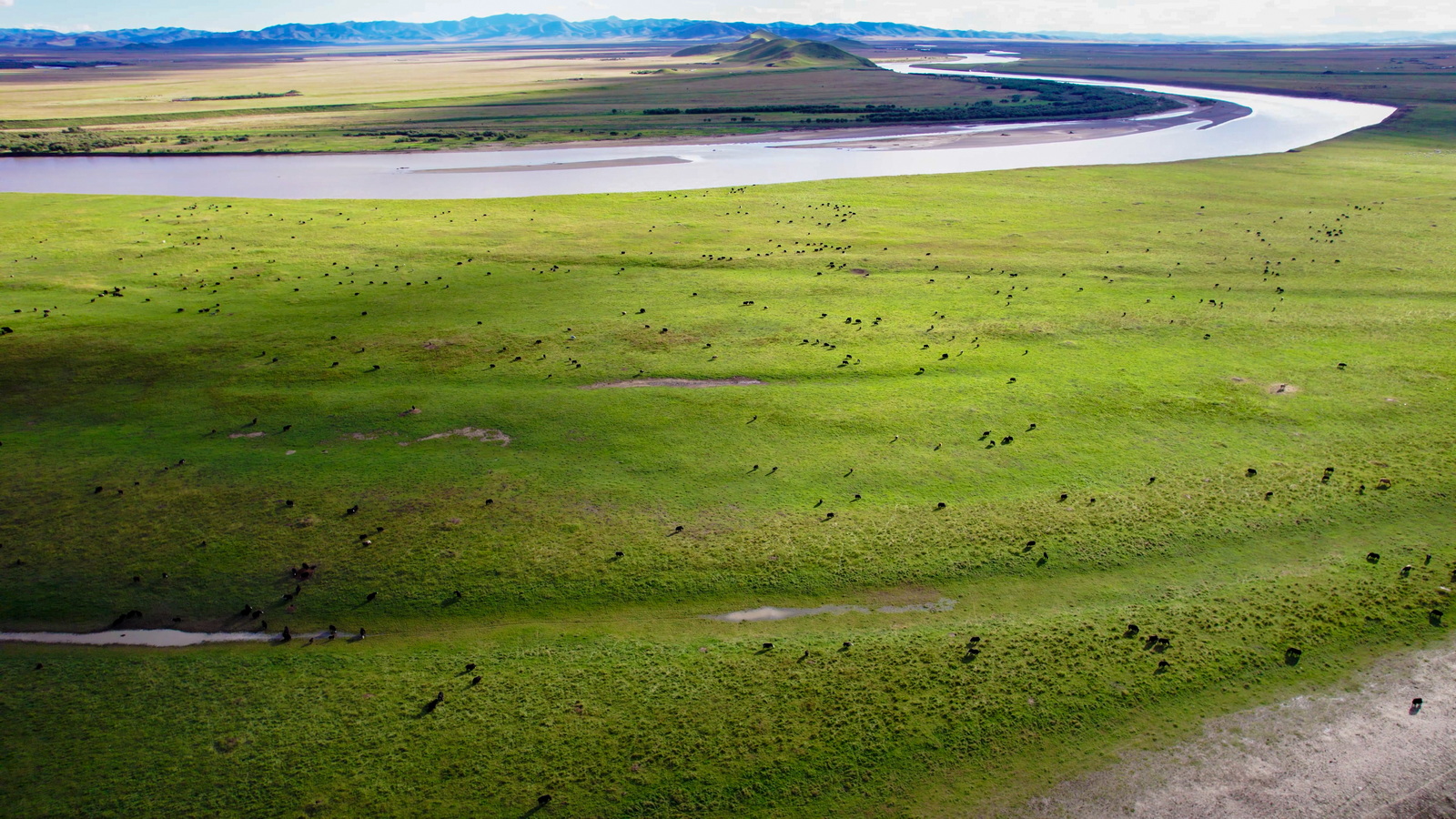 在这里航拍,就可以看到很多观景台看不到的细节了。黄河夕照,绿地牛羊,田园牧歌,安静祥和。