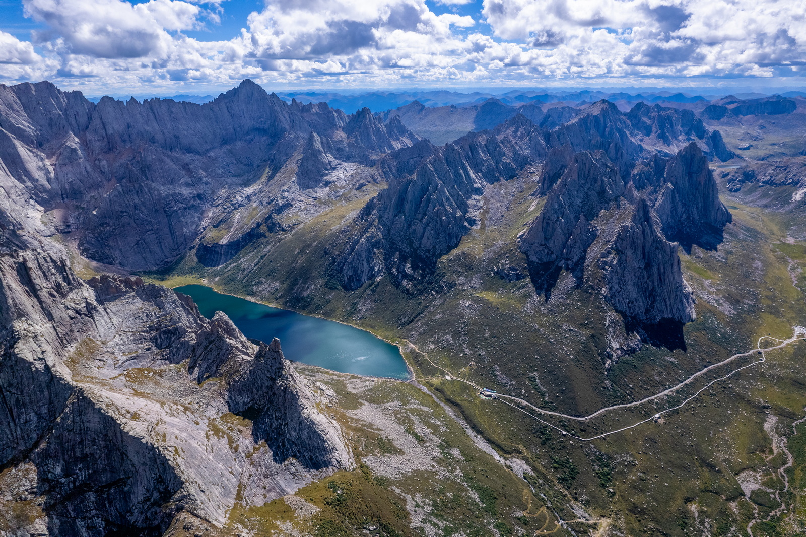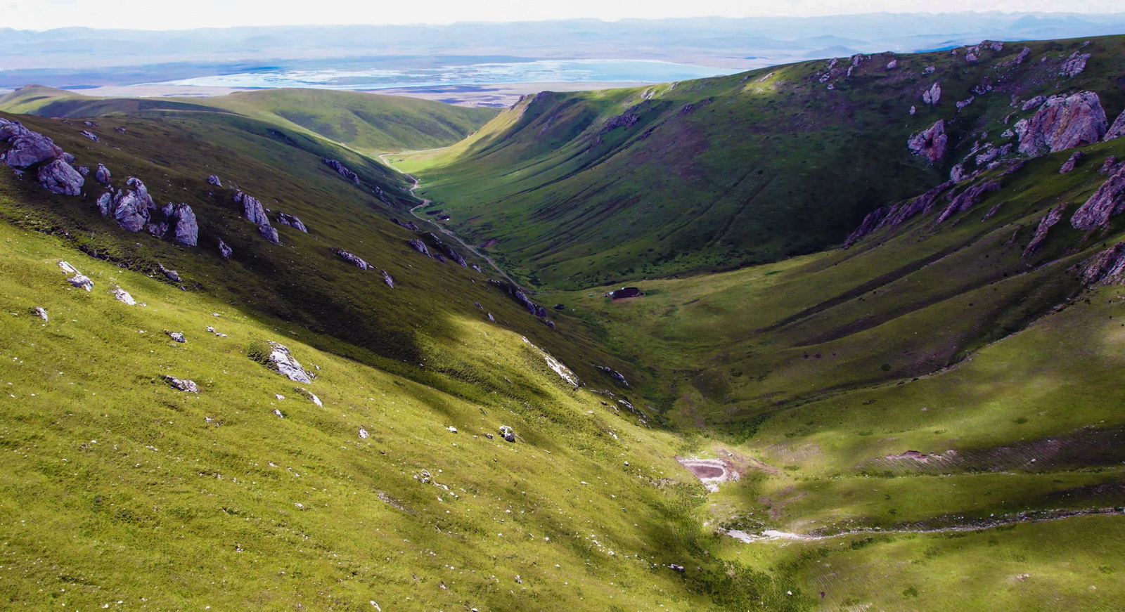 从无人机的视角回望,可以看到整条羊肠小道,以及远处的尕海。