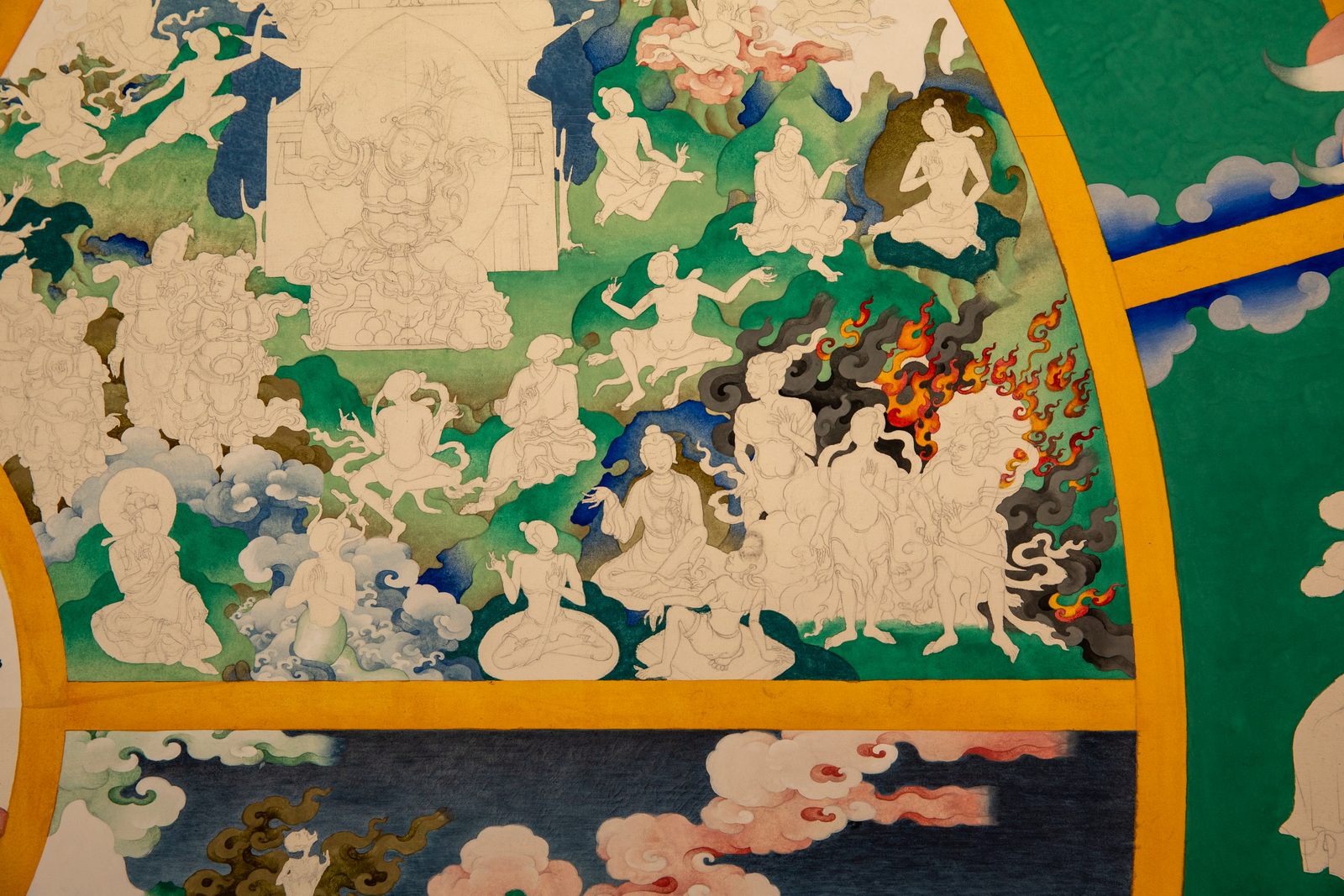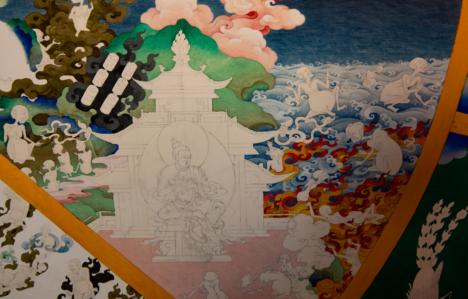 这张唐卡线稿已经完成,正在上色。仔细观摩,画工相当精湛,人物的表情、姿势、特别是手势栩栩如生。除了人物之外,还有很多小鬼妖怪,造型奇特,想象力丰富,其中可能还蕴藏着凡人不了解的典故。