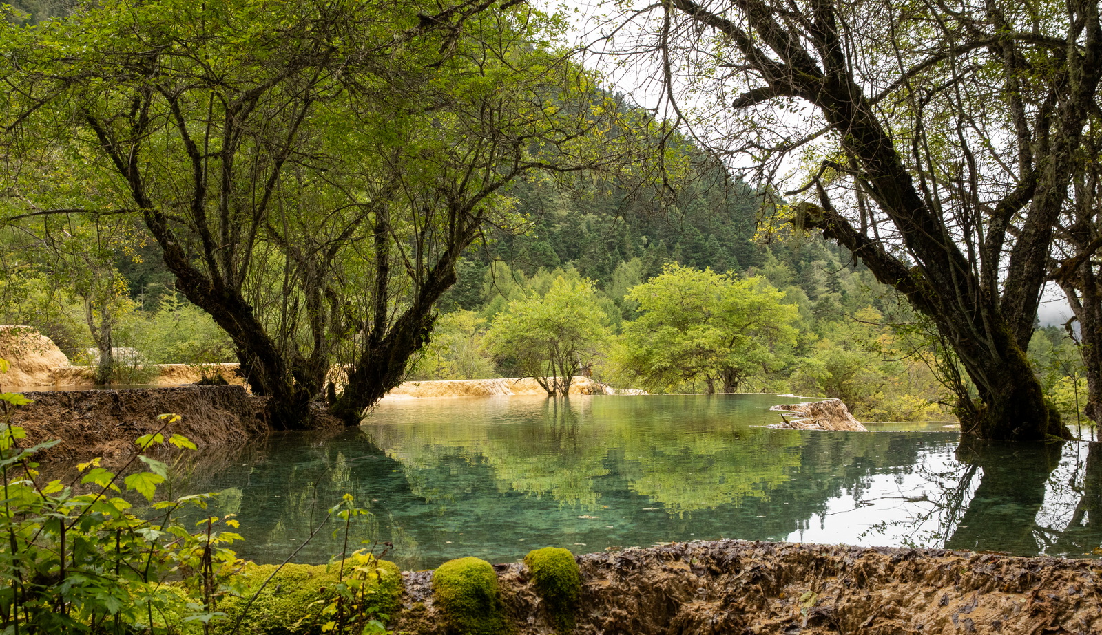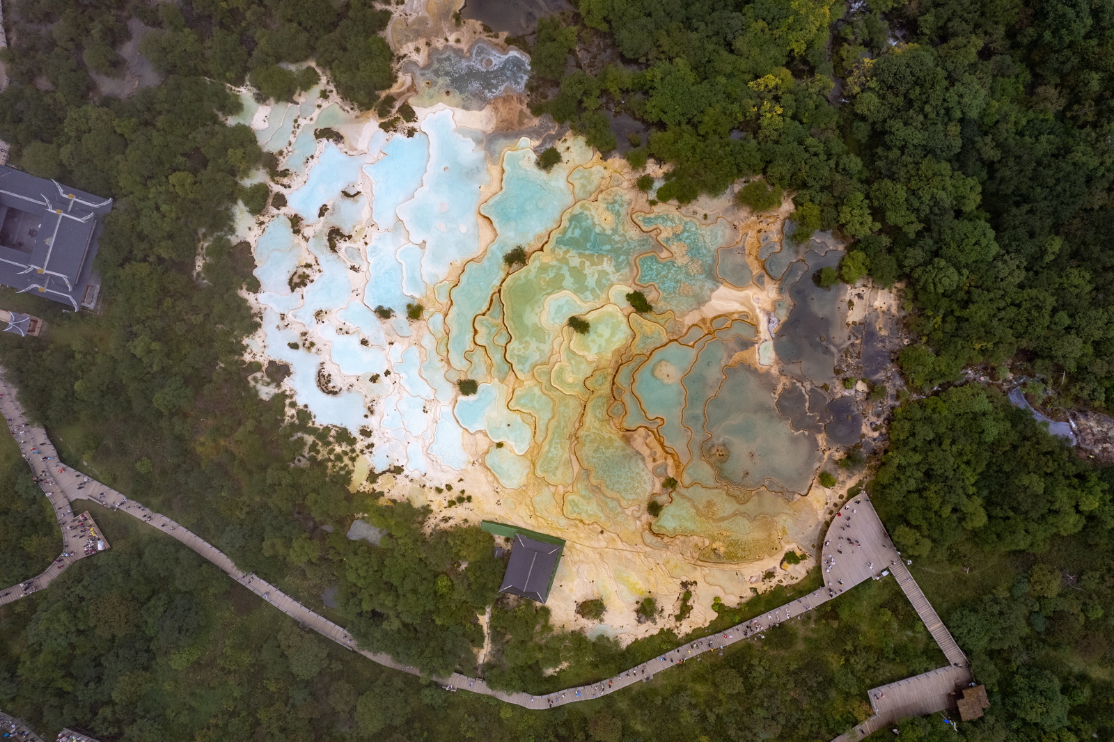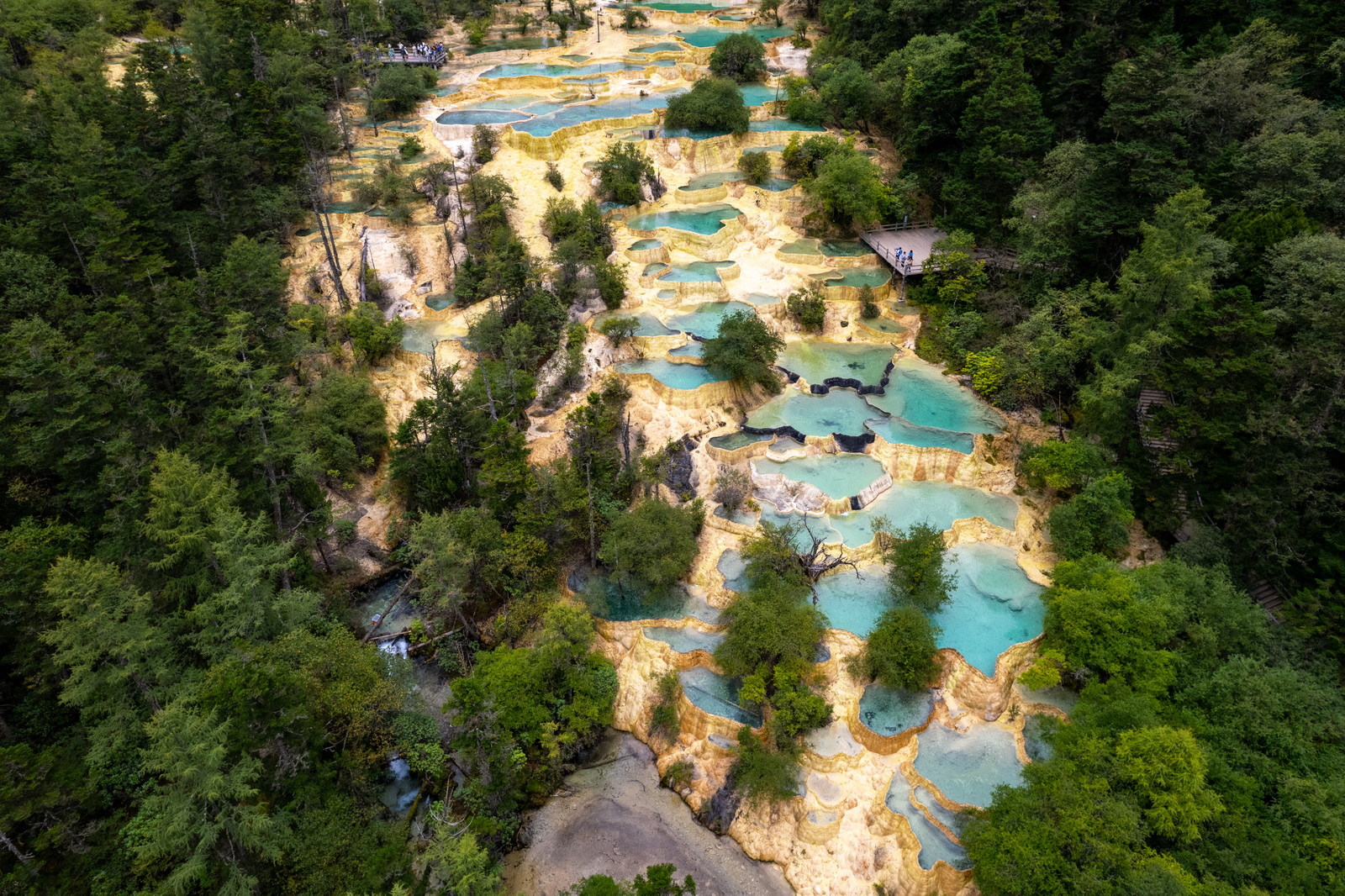 算算时间差不多了,于是赶往黄龙。穿过一条8公里长的隧道,天气整个变了。外面艳阳高照,内里则是乌云密布,像是进入了异次元空间。想当然地以为黄龙的天气和松潘一样,这是战略性的失误。风景虽然打了折扣,但黄龙主打的钙化池是非常独特的。9月的黄龙正是雪融水最丰盈的时候,走在其间,流水淙淙,空气清新,按正常逻辑,逛一逛还是很舒服的。然而一双大腿因为在黄河第一弯1200级台阶上过度使用,此时已经疼痛难当。那么,能省几步是几步吧……五彩池就不绕了,用无人机更可一睹全貌。