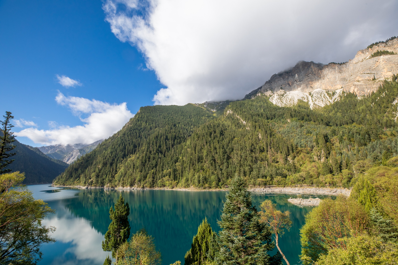 在唐克镇计划住两天,可以稍事休整。但第二天的行程还是颇具强度,目标是莲宝叶则。莲宝叶则在卫星图上是一个非常神秘的所在:在茫茫的绿色大山中,一片矩形的区域突兀地显示为白色,蓝绿色的大小湖泊点缀其间,不用更多的解释,它的存在本身就天然具备一种神圣感。原本以为既然可以驾车进入,那么就可以遍历整个莲宝叶则,但遗憾的是对于自驾而言,目前只开放最南边的一条线。