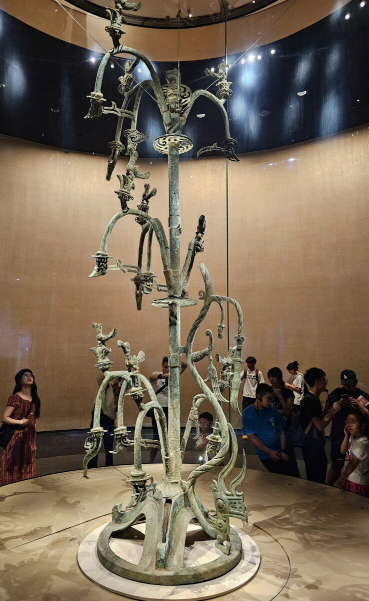 最神秘的,也是最吸引我的是青铜神树。看过《盗墓笔记》的人,一定对书中能够蛊惑人心,乃至靠想象凭空造物的青铜神树印象深刻。三星堆的青铜神树当然没有《盗墓笔记》中那么夸张,但也高达近4米,它实际上是祭拜太阳神的礼器,代表着东方日出的扶桑和西方日落的若木。