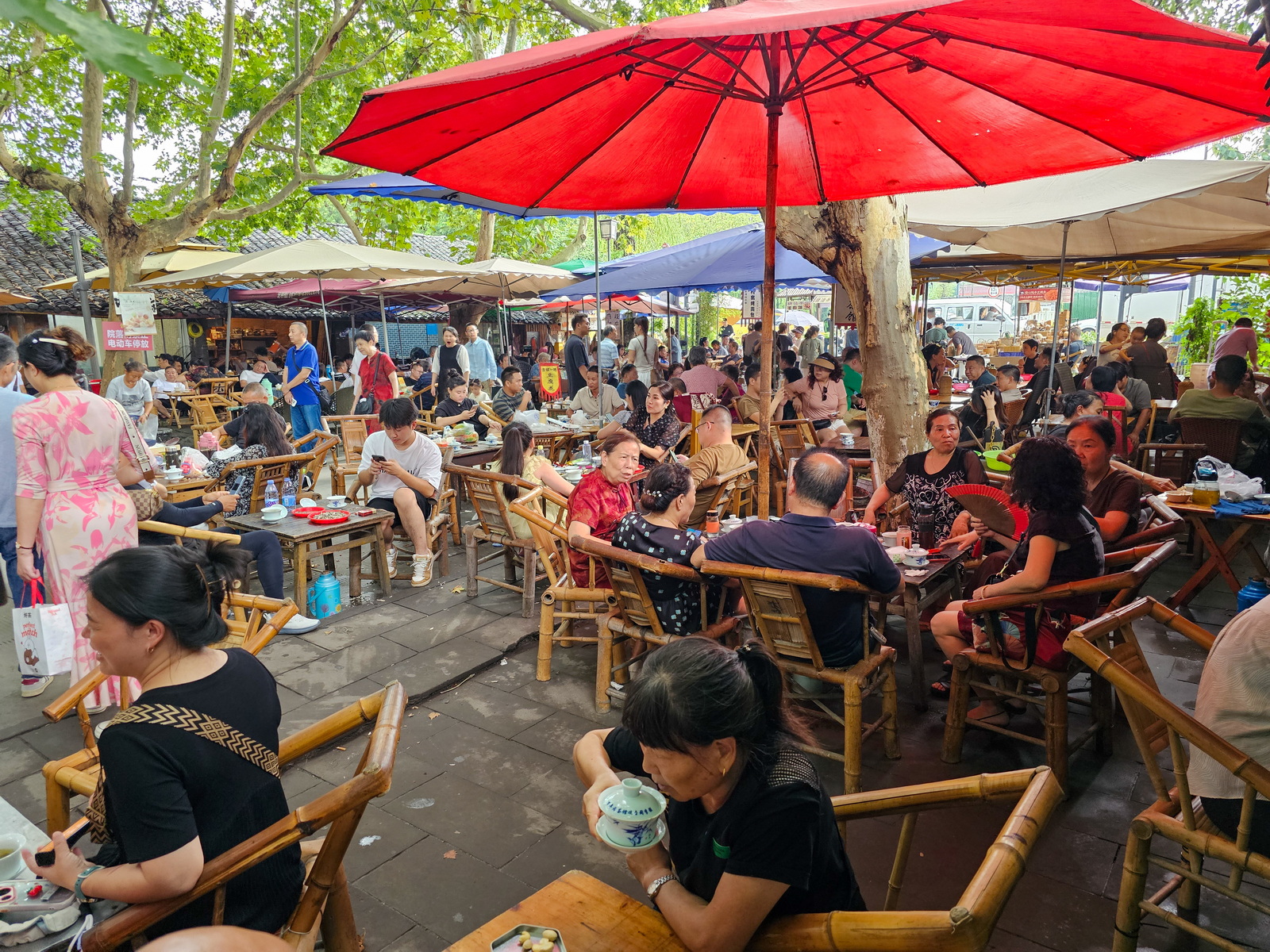 在成都的两天自然是火锅、蹄花、喝茶、采耳。已经是中秋假期,人民广场必定是摩肩接踵,于是选择偏远一点的彭镇老街。没想到喝茶的人仍然满满当当,好不容易才寻到一张桌子。按照惯例采个耳,喝两壶茶,就这么过一下午,感受一下成都人的巴适。