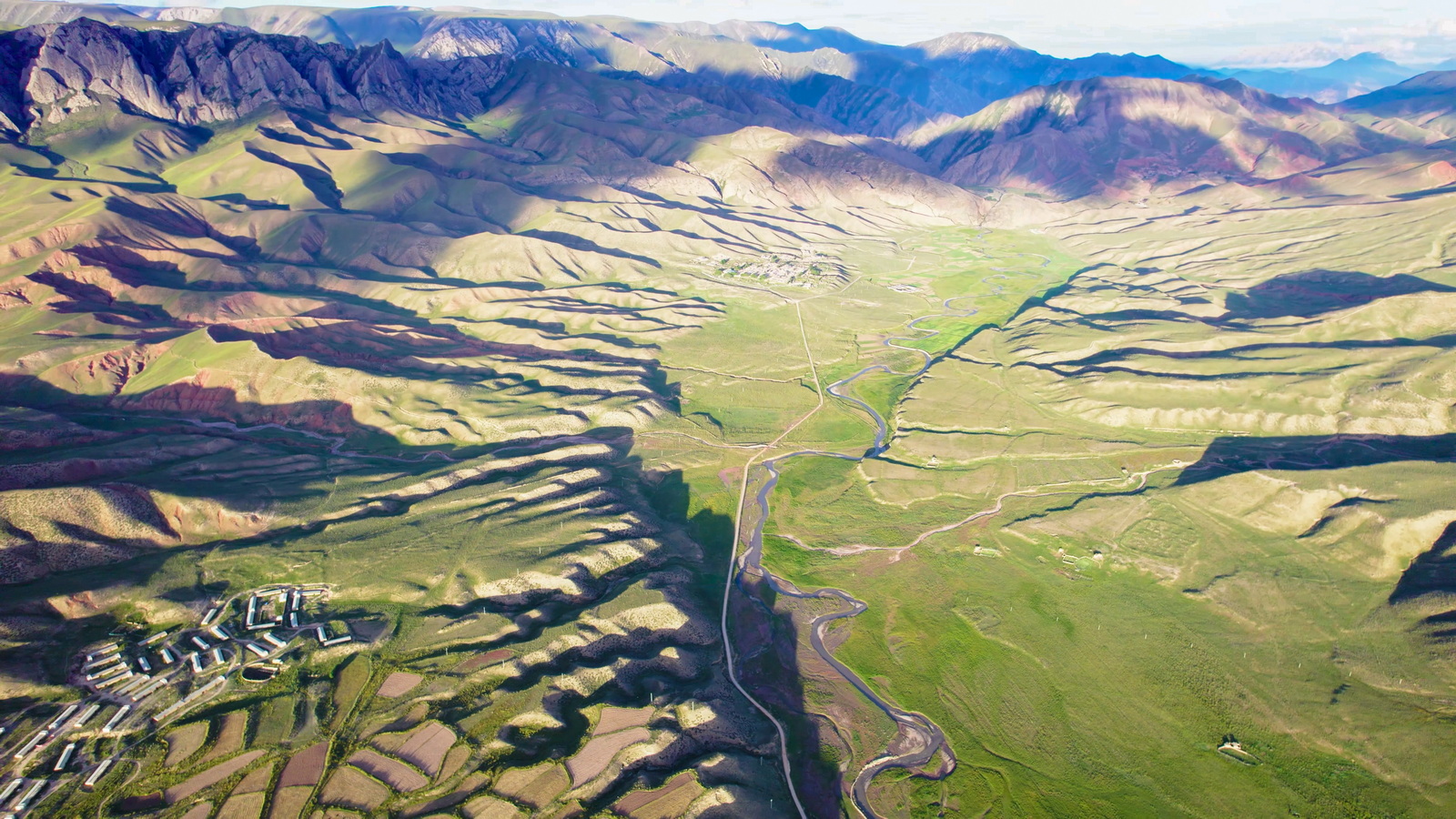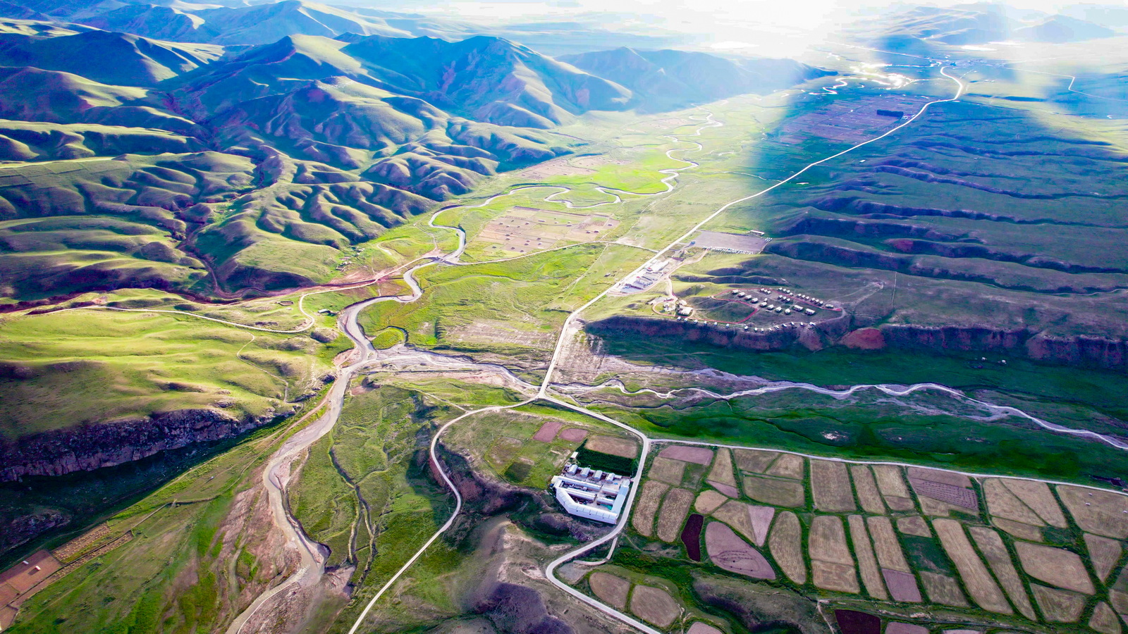 对沿途的黑河牧场,原本并没有抱有太大的期待,只是午饭时分刚好到达这里,卫星图上又显示穿过一缕黑河的河湾,于是安排一个航拍点。结果意外地还不错,黑河牧场的房屋特别整齐地拉出一条直线,恰与黑河的婉转迂回相得益彰。