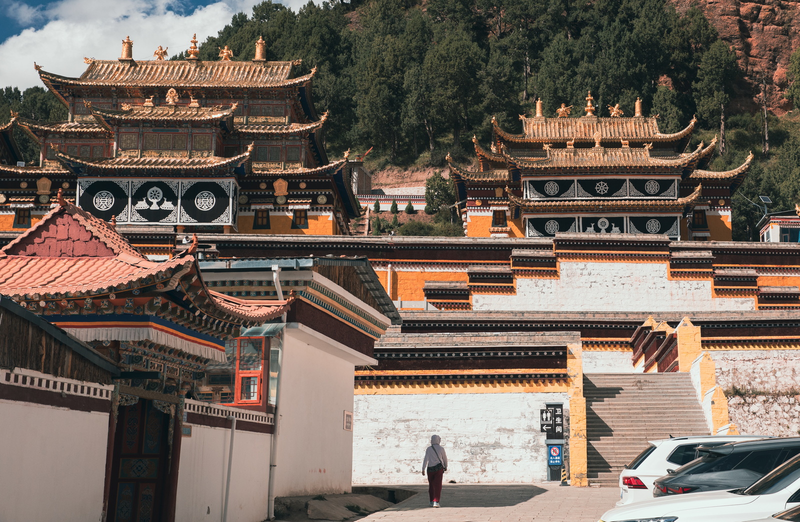一路走走停停,到了郎木寺天色还早。于是打算寺内逛一逛。郎木寺其实是镇名,纵跨甘肃、四川两省,其中两座寺院,甘肃寺院叫“赛赤寺”,四川寺院则叫“格尔底寺”。由于赛赤寺似乎更好停车,于是自然而然选择了赛赤寺。询问售票处得知,除门票之外只需再支付5元,即可驱车进入,这可太方便了,比拉卜楞寺轻松多了。